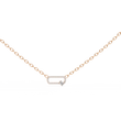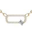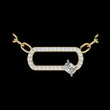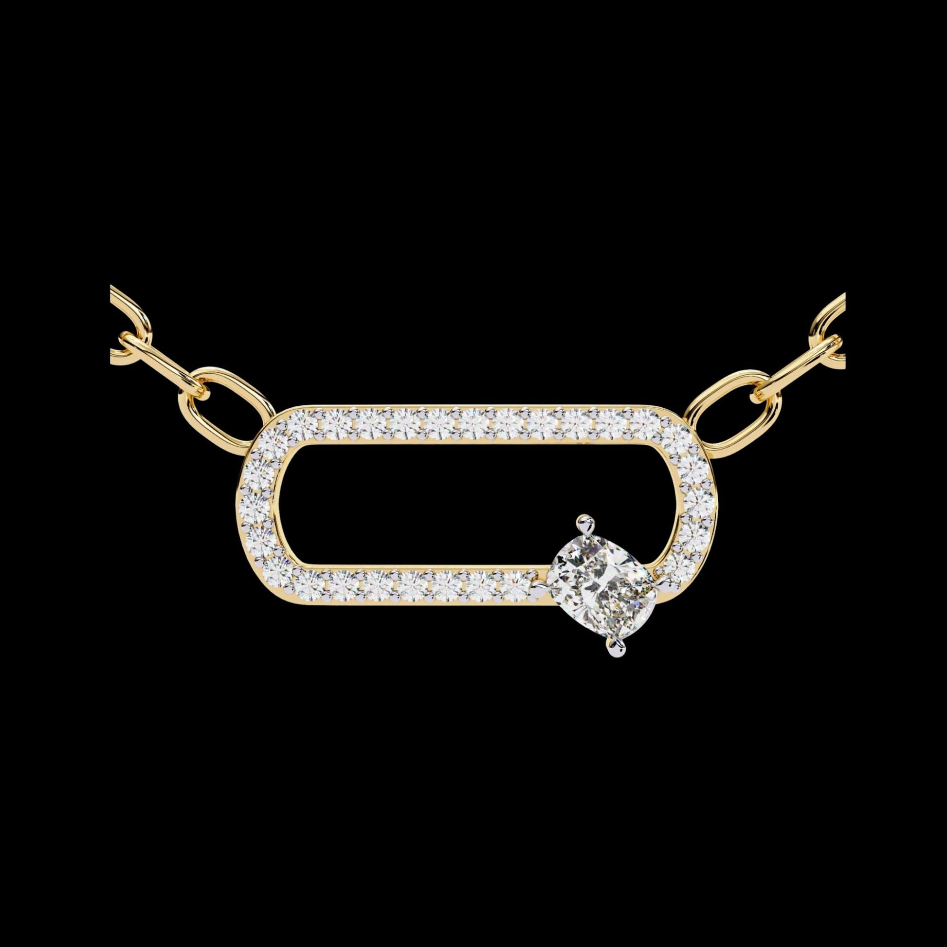 This pendant features a modern open-oval link design crafted in polished gold and fully accented with shimmering pave-set round stones, giving it a sleek, contemporary sparkle. A single cushion square solitaire diamond is set along the lower edge, adding an elegant focal point and a touch of asymmetry that enhances the piece’s unique character. The pendant is suspended from matching gold links, creating a harmonious blend of sophistication and modern style, perfect for both everyday wear and refined occasions.