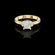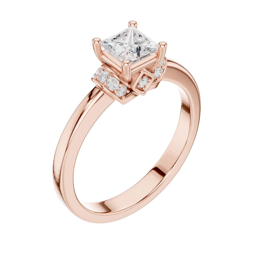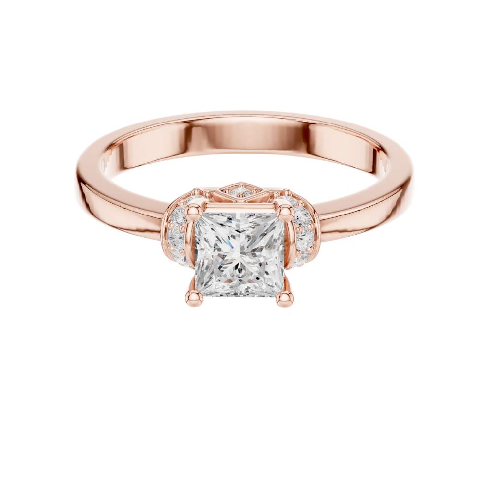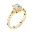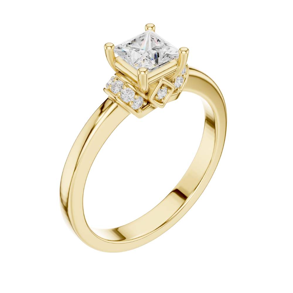 This elegant ring showcases a brilliant princess-cut center stone set in warm gold, framed by a refined halo-inspired arrangement of sparkling accent round diamonds. The clean, polished band enhances the modern yet timeless design, while the sculpted setting adds a touch of vintage charm. With its perfect balance of sophistication and radiance, this ring offers a beautifully unique twist on a classic solitaire style by Ivevar.