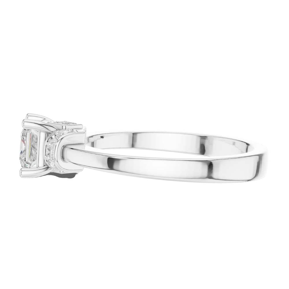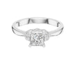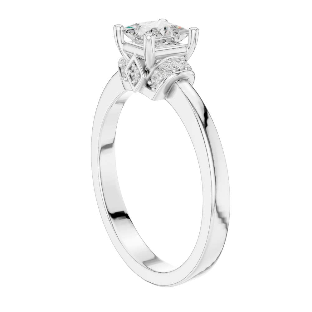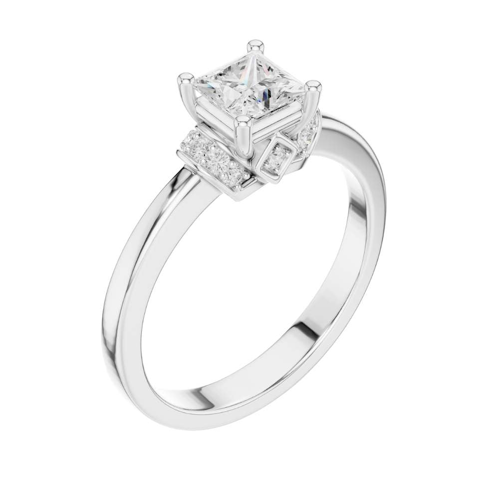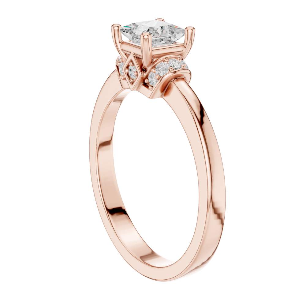 This elegant ring showcases a brilliant princess-cut center stone set in warm gold, framed by a refined halo-inspired arrangement of sparkling accent round diamonds. The clean, polished band enhances the modern yet timeless design, while the sculpted setting adds a touch of vintage charm. With its perfect balance of sophistication and radiance, this ring offers a beautifully unique twist on a classic solitaire style by Ivevar.