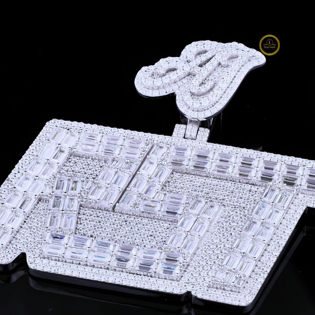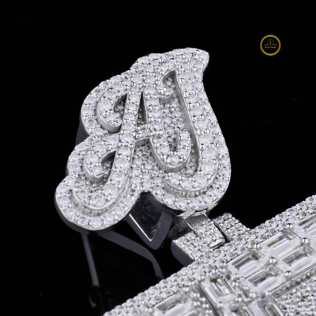 This image displays a luxurious custom pendant featuring a bold, rectangular design with a prominent, scripted initial "A" on top. The pendant is intricately set with numerous Moissanite "diamonds"—a popular and durable diamond alternative.