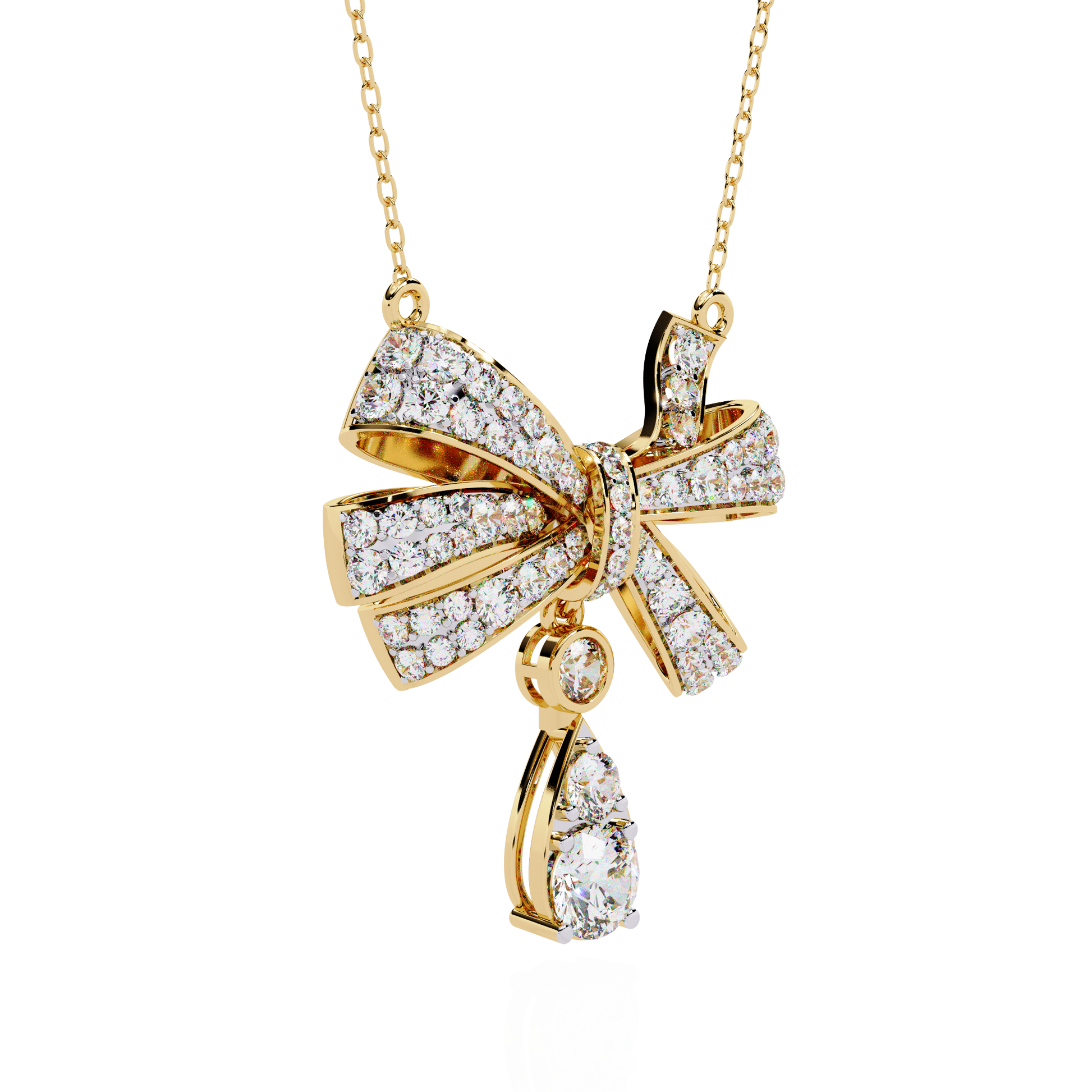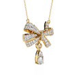 This stunning necklace features an Exquisite Bow Design, gracefully crafted in gold and adorned with Brilliant Round Cut Diamonds that shimmer with every movement. The bow’s elegant loops are intricately paved with sparkling stones, while a teardrop-shaped round diamond dangles delicately beneath, adding a touch of sophistication and allure. The Ivevar's necklace is suspended from a fine gold chain, creating a luxurious and feminine statement piece perfect for special occasions or adding glamour to everyday wear.