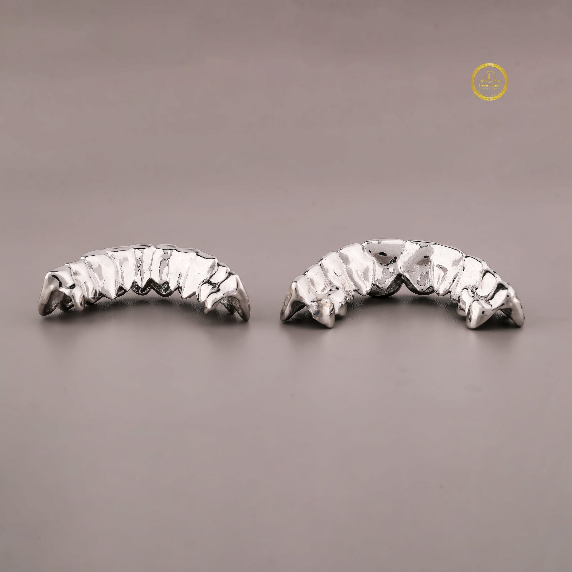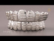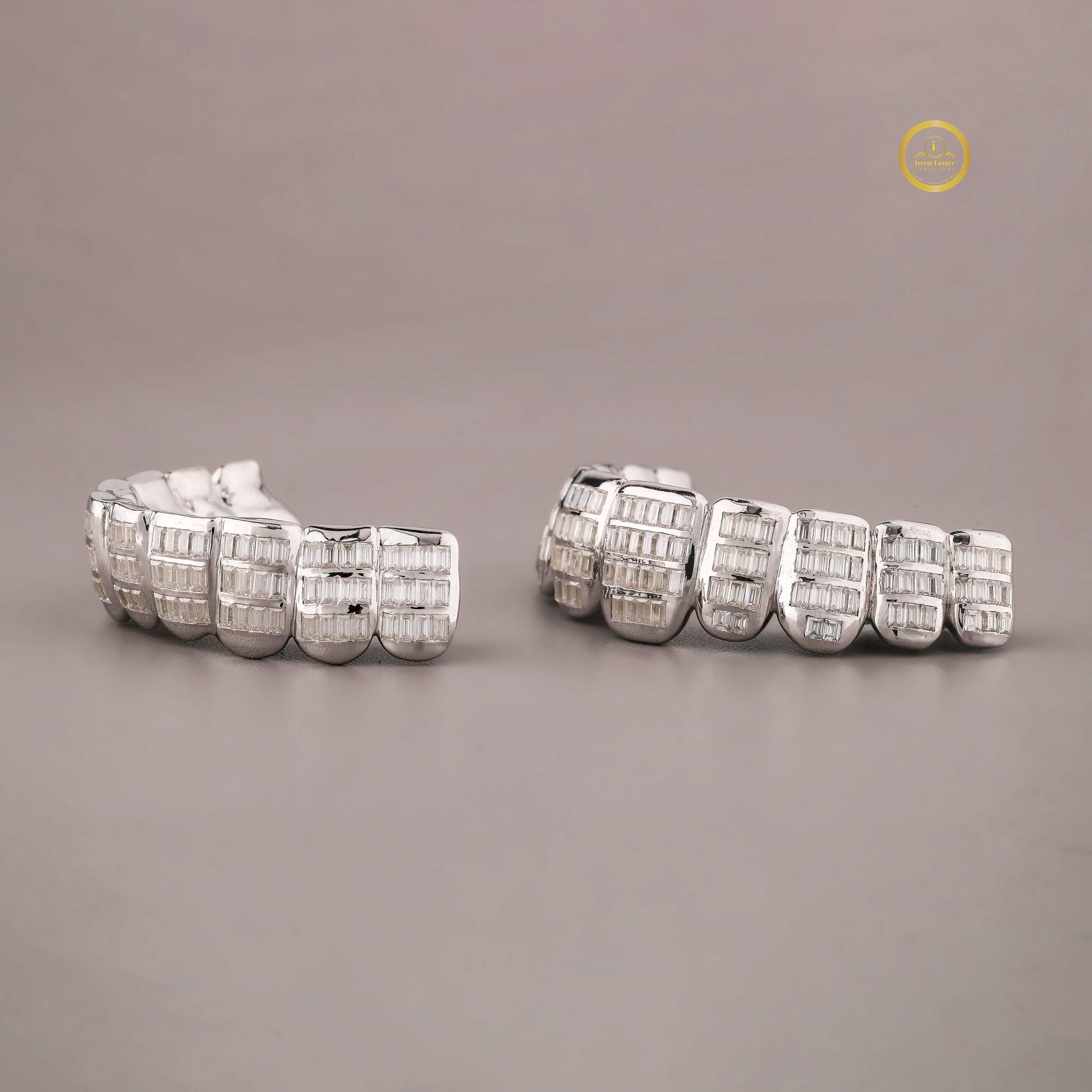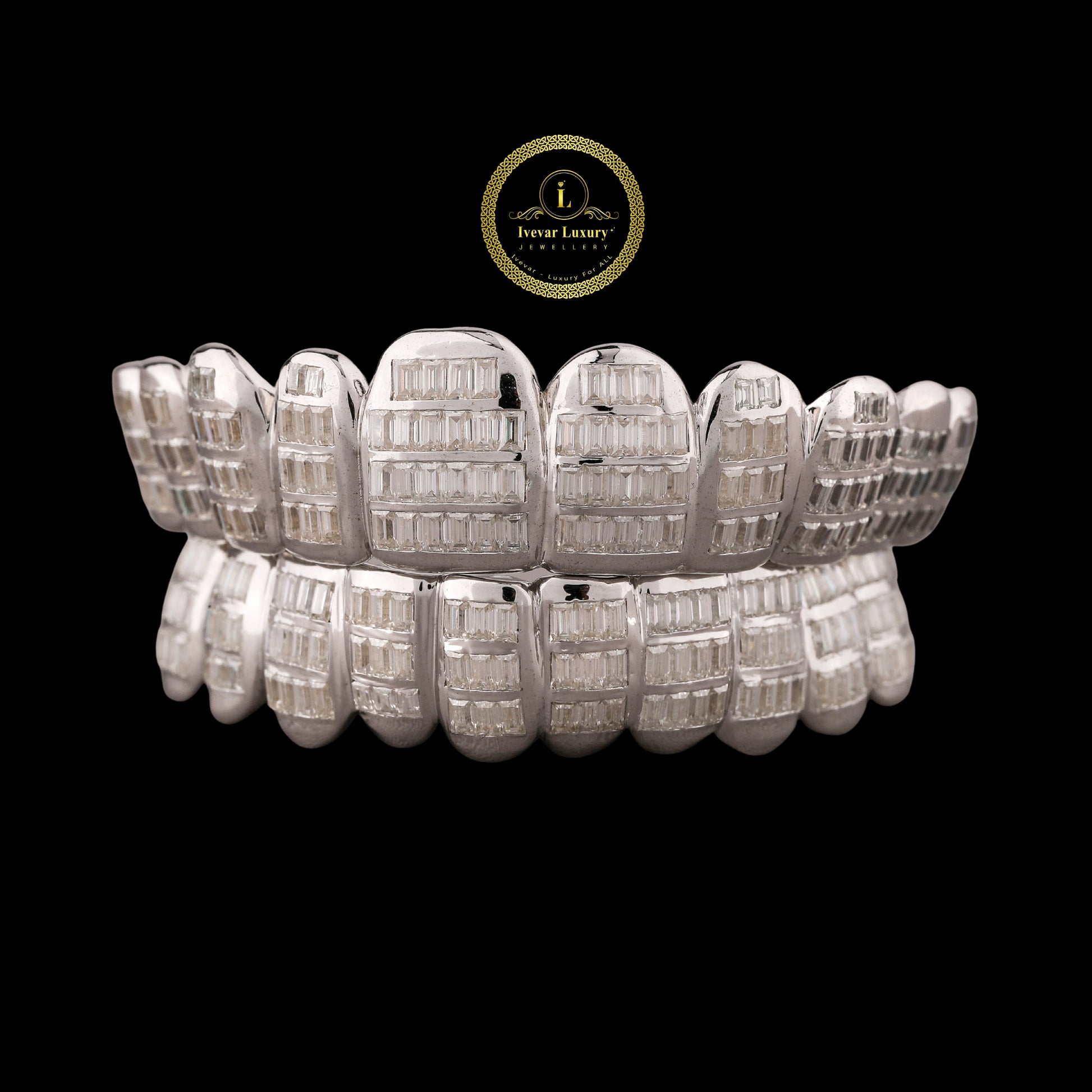 These luxurious dental caps feature a complete top and bottom set, distinguishing them from the previous design. The most notable feature is the use of baguette-cut Moissanite stones, which are rectangular and set in straight, horizontal rows across each tooth. This setting style, known as an invisible or channel setting, minimizes the visible metal prongs, allowing the stones to sit flush and create an uninterrupted, mirror-like surface of brilliance.