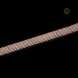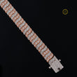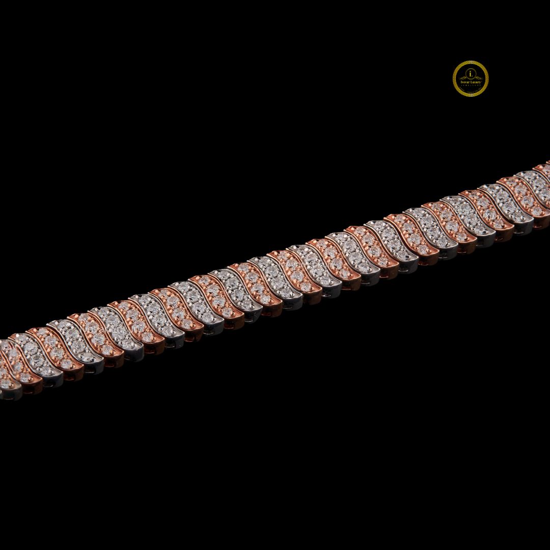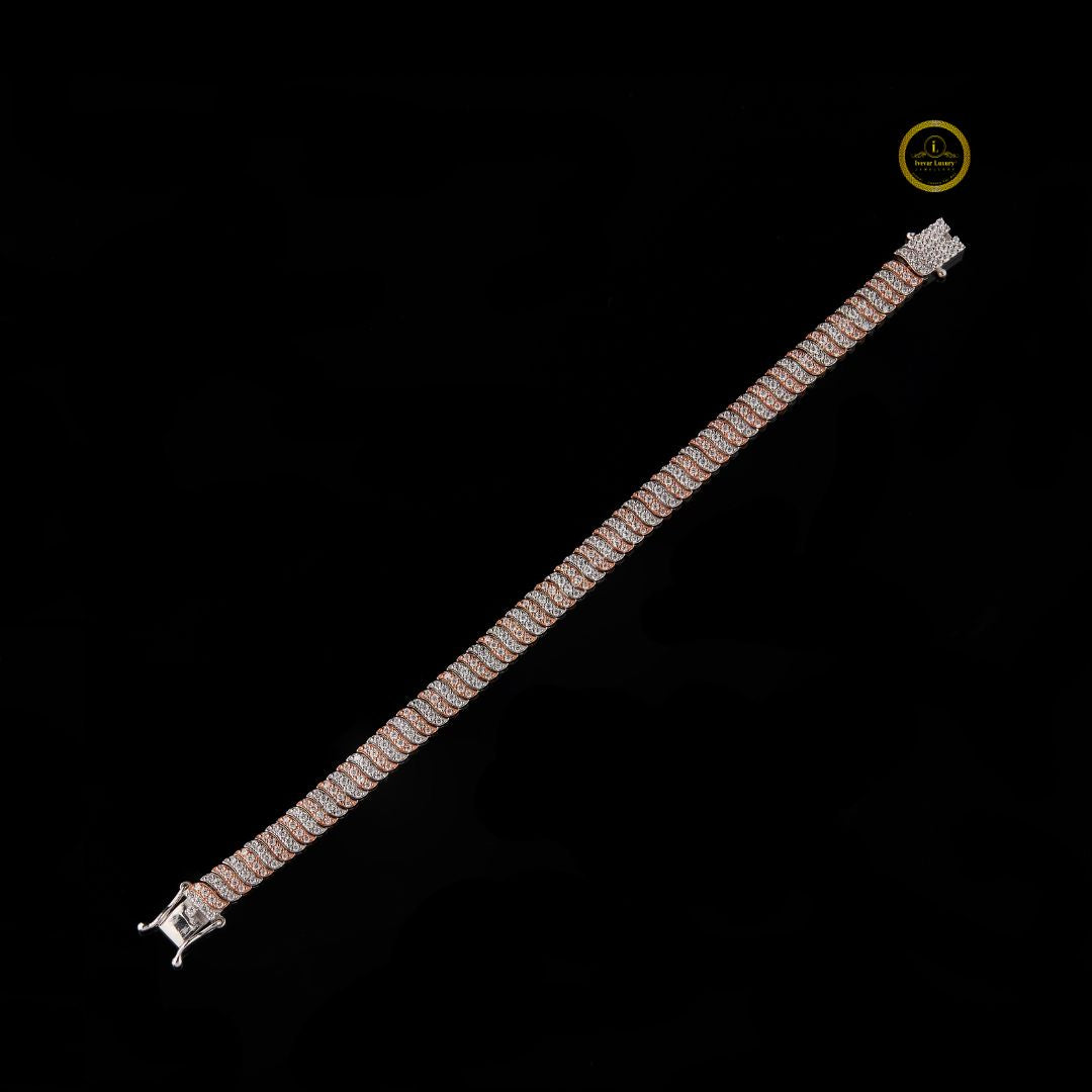 This bracelet is a sleek, modern take on a classic style, featuring a unique two-tone design. It consists of multiple narrow rows of links, half finished in a warm rose gold tone and the other half in a contrasting silver or white gold tone.