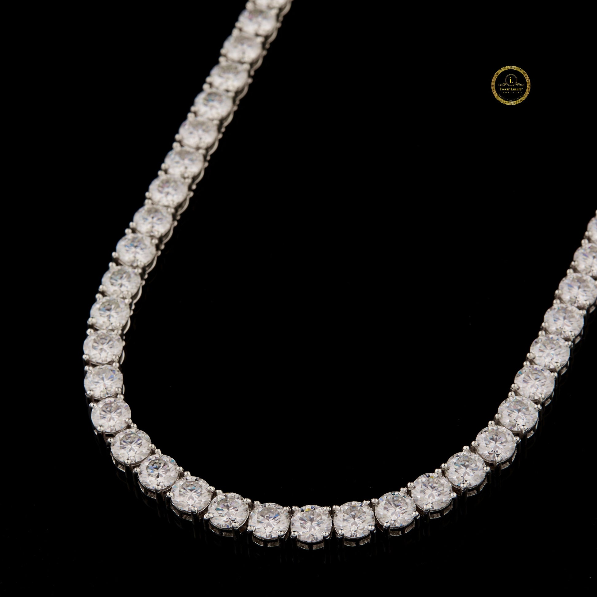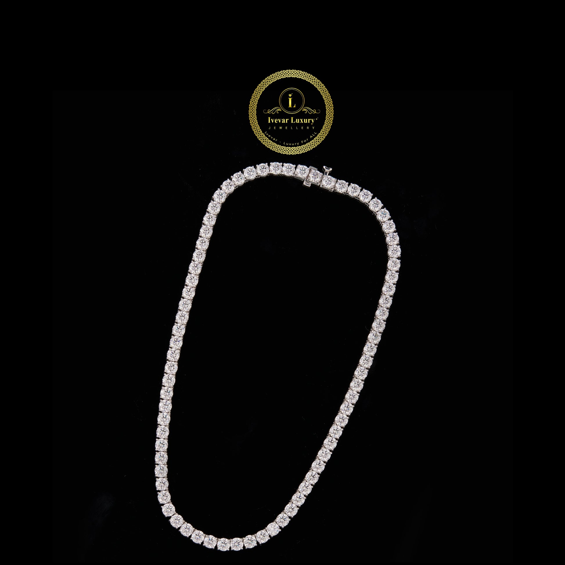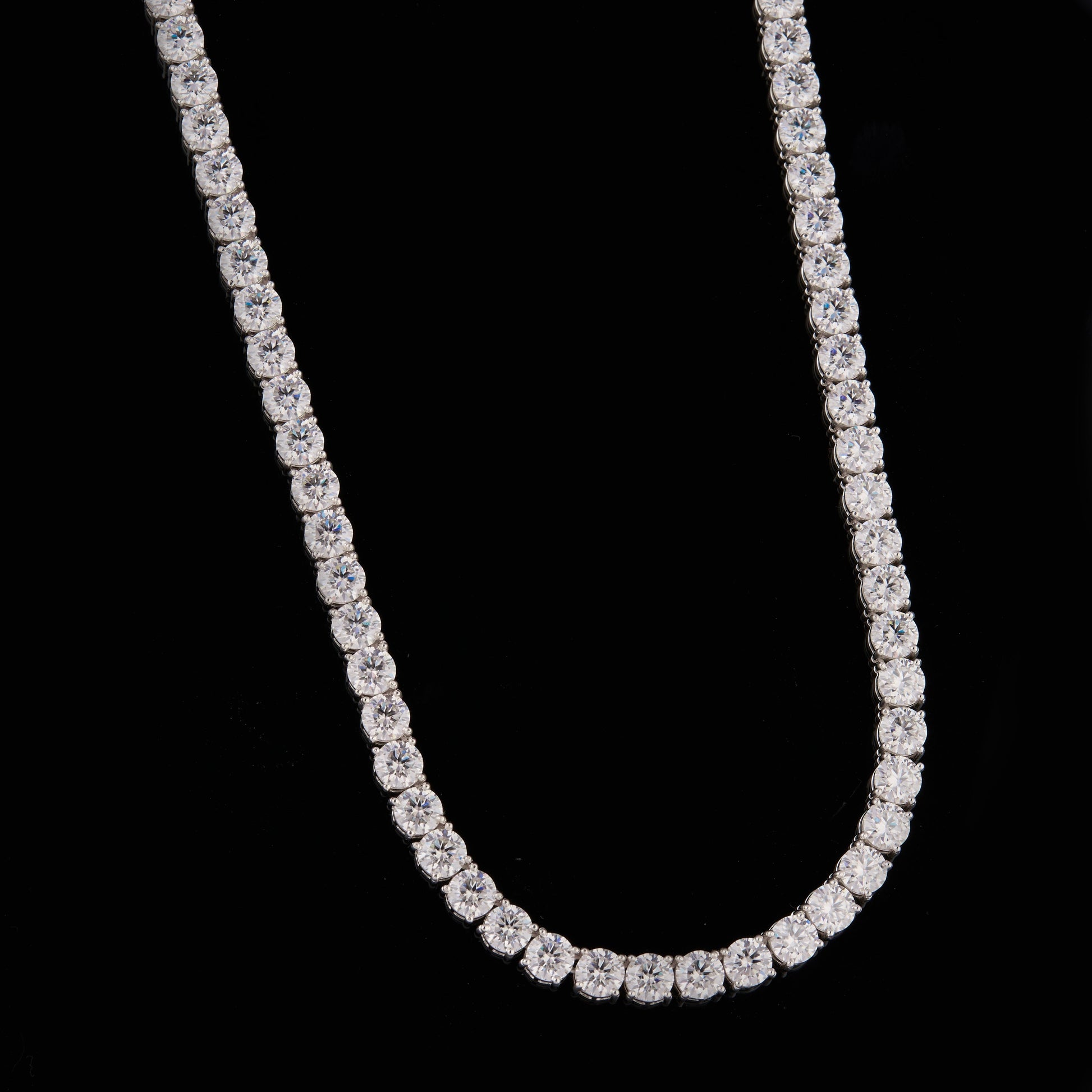This image displays a quintessential tennis chain, characterized by a continuous, flexible line of individually set, round-cut stones. It is fully "iced out" with brilliant moissanite stones, which are known for their exceptional fire and brilliance, rivaling that of diamonds.