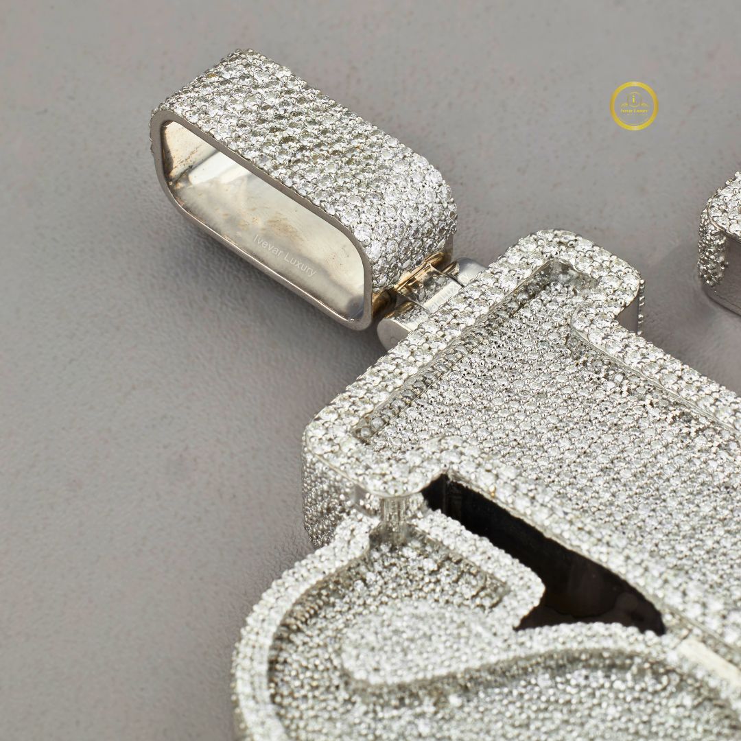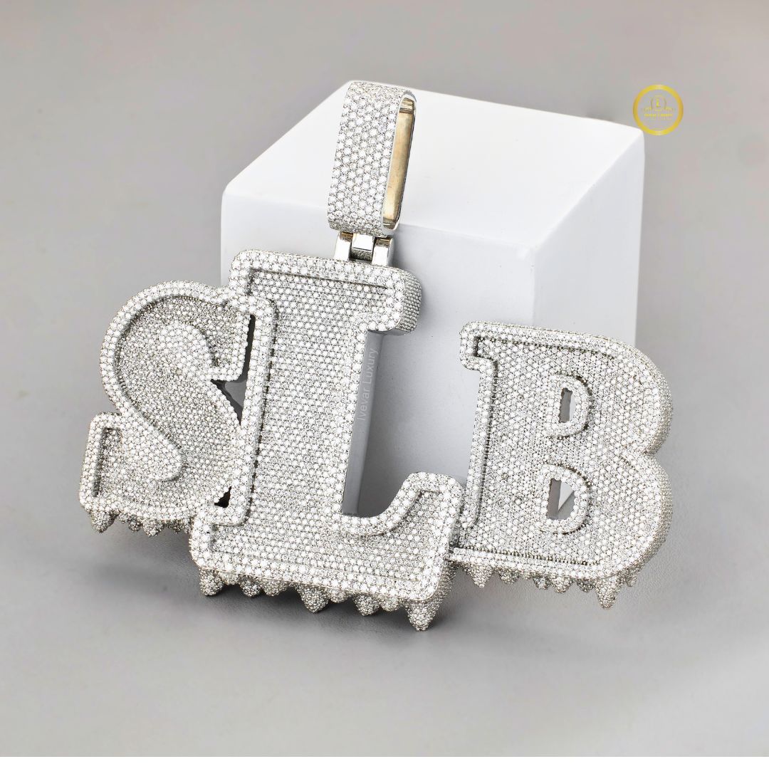 This is a striking, single-color custom initial pendant fully covered in brilliant-cut lab-grown diamonds. The piece is crafted in a single precious metal tone (likely white gold or platinum-plated), giving it a solid, frosty appearance. The letters are thick and block-style, creating a substantial, heavy look. The diamonds are meticulously pave-set across the entire surface and even extend to the large bail (the loop for the chain), ensuring maximum sparkle from every angle. The bottom edges of the letters feature a dramatic, dripping, or jagged texture, adding a unique, modern edge to this luxurious hip-hop-inspired piece.
