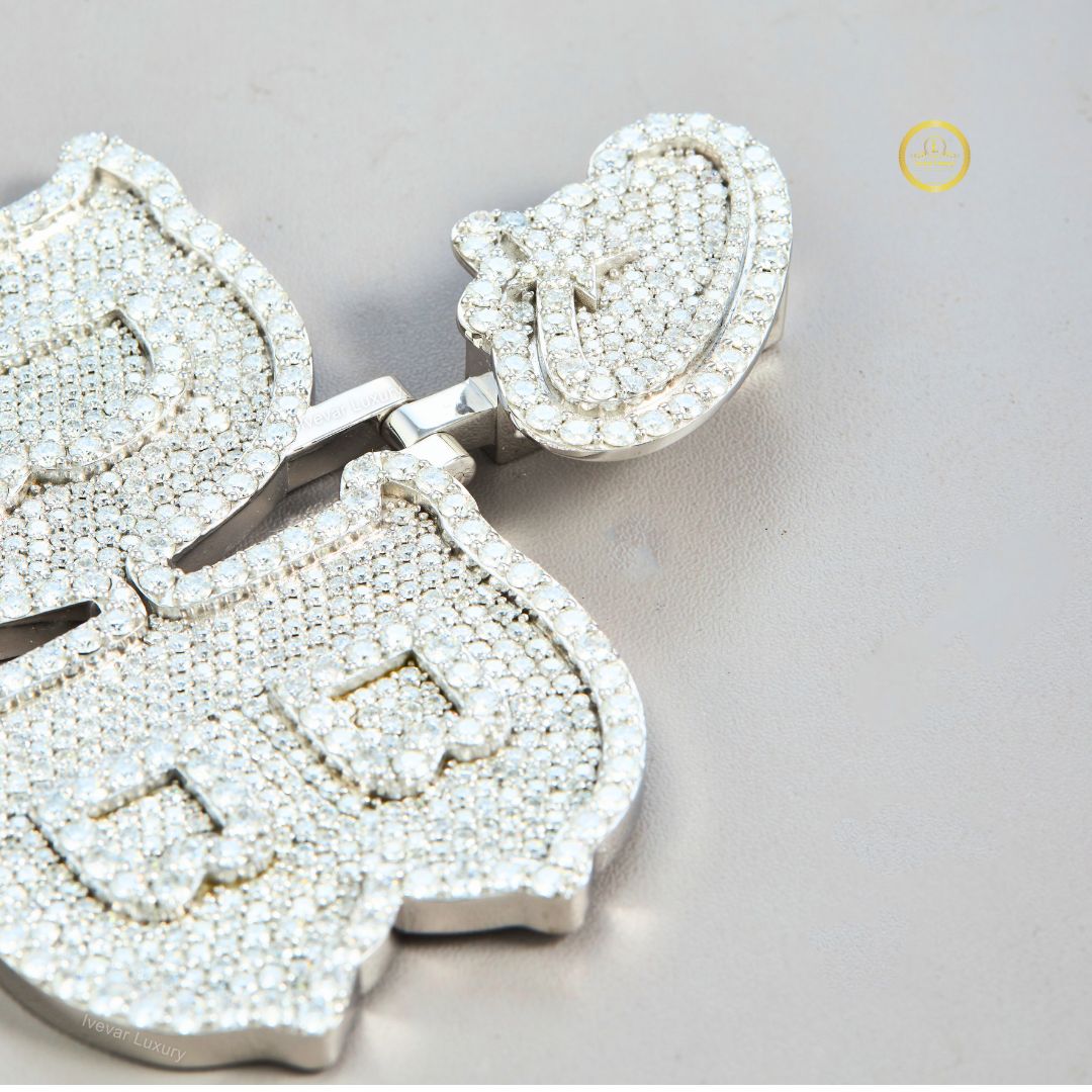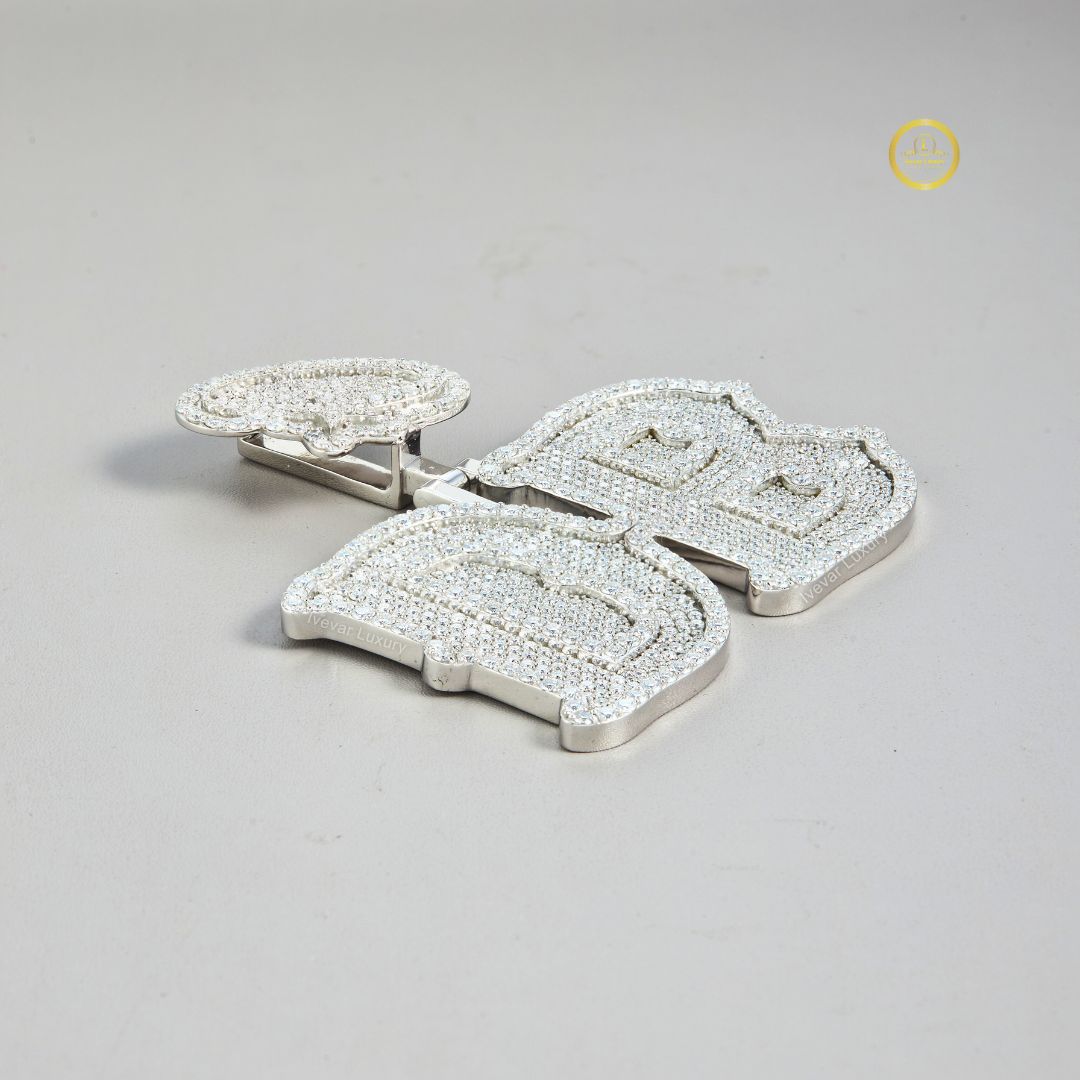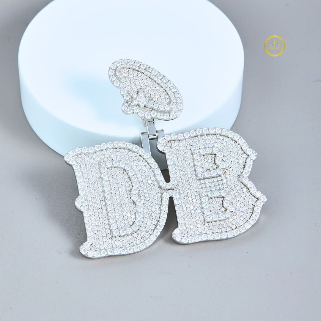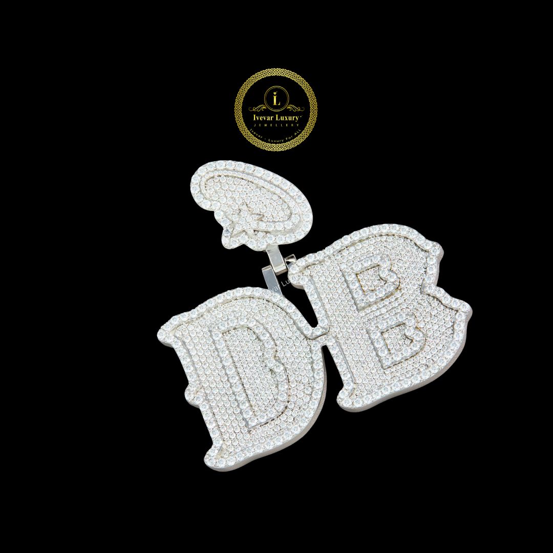 The pendant features the initials "D.B." in a bold, stylized Old English or gothic font, fully set with brilliant-cut lab-grown diamonds. This piece maintains a consistent frosty look, likely using white gold or silver plating for the metal. Uniquely, a small, fully diamond-paved symbol (possibly a stylized leaf, teardrop, or apostrophe) is attached above the "D," adding a distinctive, personalized touch. The overall design is substantial, heavily paved with diamonds, and crafted with a hip-hop jewelry aesthetic. The use of lab-grown diamonds provides a high-end, luxurious sparkle while maintaining ethical sourcing.