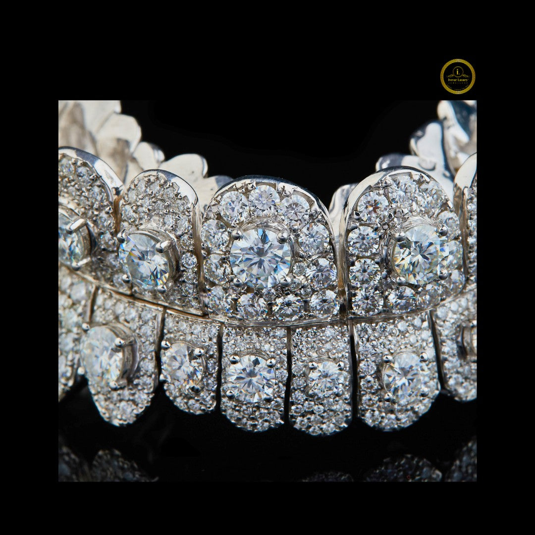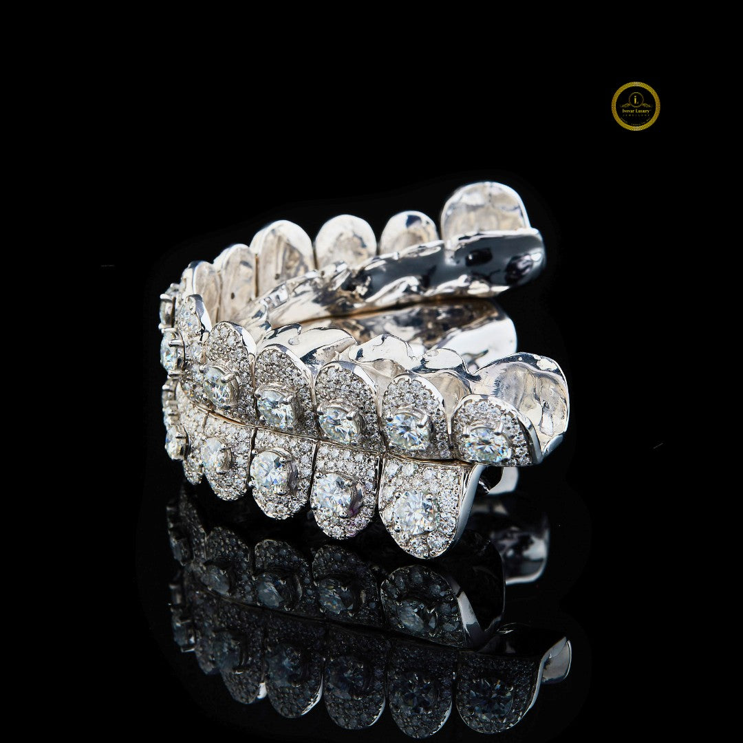 This piece is a magnificent example of "iced out" custom grillz, designed for luxury street style. It features brilliant, high-quality Lab Grown stones, a popular and more affordable diamond alternative known for its exceptional fire and sparkle (often surpassing that of natural diamonds).