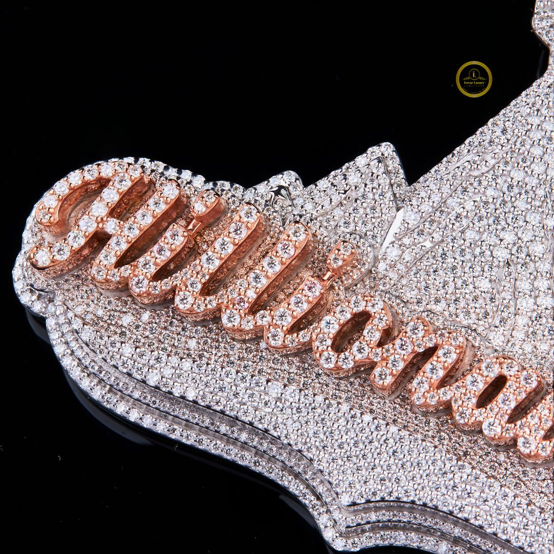 This bold pendant features the word "Hillionaires" layered over a dramatic, diamond-paved mountain or peak motif. The design utilizes a striking two-tone effect: the mountain backdrop is fully paved with lab-grown diamonds set in white metal (creating a snowy or icy look), while the word "Hillionaires" is set in contrasting rose gold for maximum visual pop. The large, fully-paved bail integrates seamlessly into the mountain shape. This piece is a heavy, statement-making jewelry item that combines textual aspiration with a powerful, iconic image.