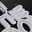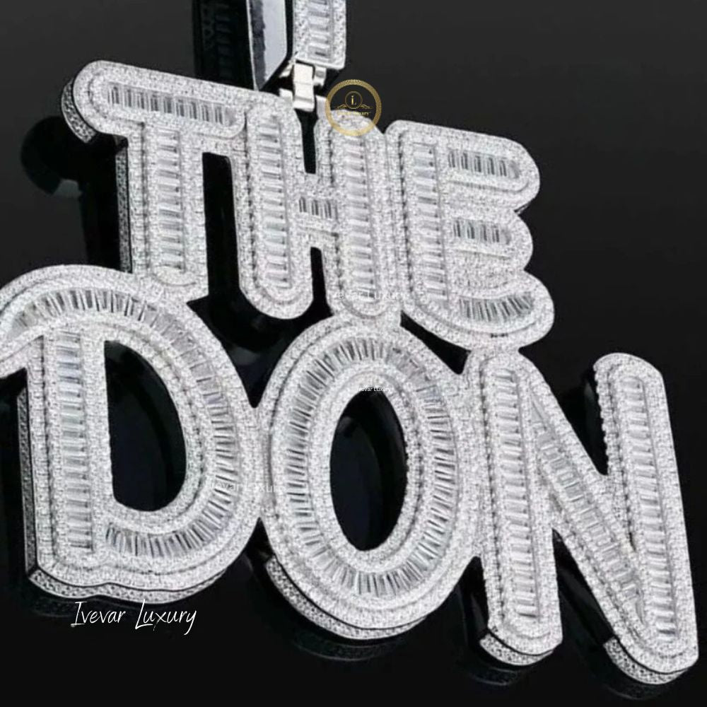 This is an extravagant custom pendant from the "Ivevar Luxury" collection, spelling "THE DON" in a bold, layered script. Unlike the typical round pave settings, this piece is entirely set with baguette-cut lab-grown diamonds in a white metal (e.g., white gold plating). The baguette cut, with its long, rectangular shape, creates a seamless, icy look that is less flashy and more elegant than the round cuts. The large, paved bail also uses the same meticulous setting. This pendant is a substantial, high-end piece that emphasizes crisp lines and maximum coverage, offering a sophisticated, luxurious take on custom hip-hop jewelry.