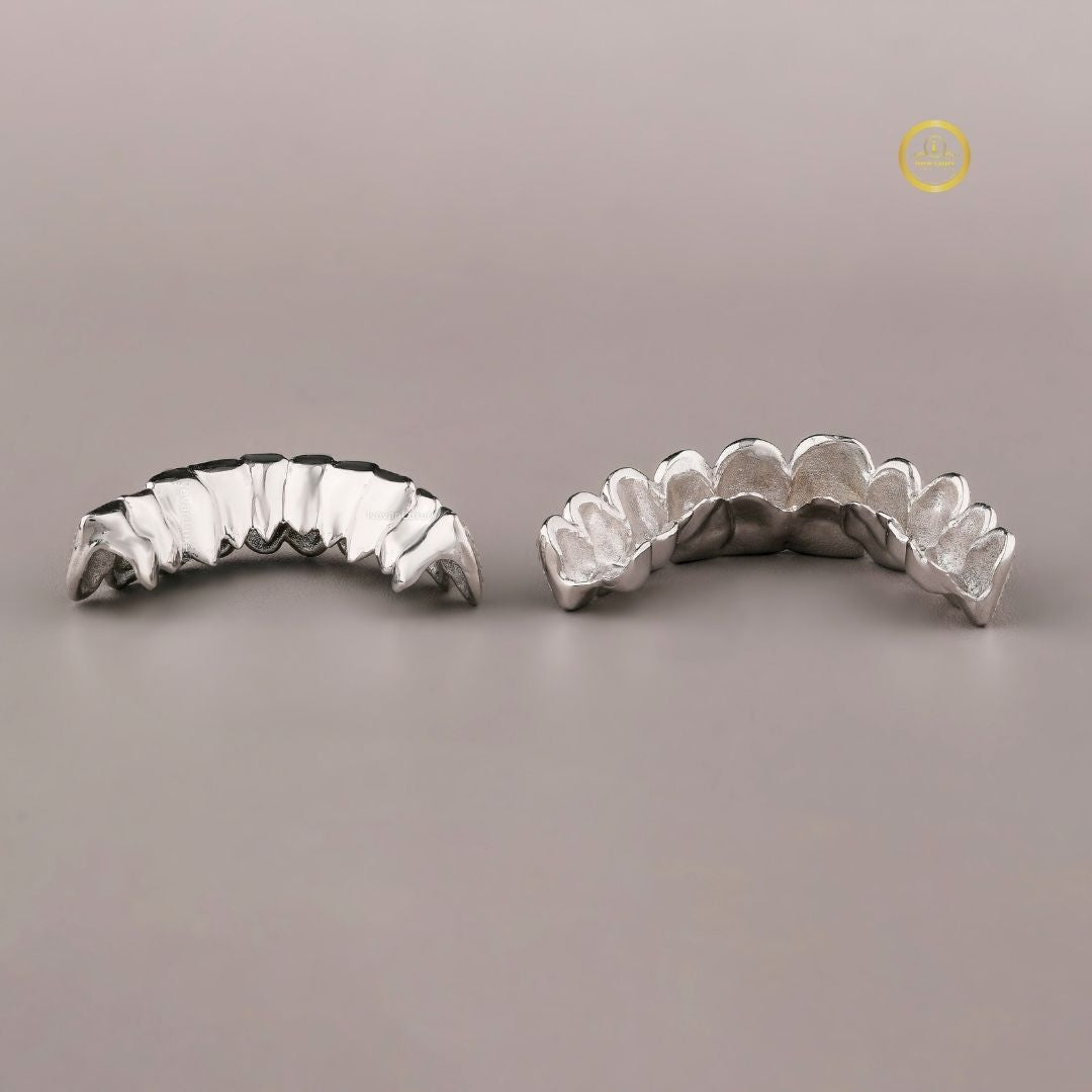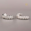 Each tooth is precisely fitted with a surface paved in multiple smaller diamonds, creating a continuous, high-shine iced-out appearance. The grillz appear to be crafted from a polished white metal, likely silver or white gold, enhancing the stones' luminosity. The branding suggests they are a luxury, custom-fitted item, ensuring maximum comfort and a secure fit. These statement pieces are the epitome of high-end hip-hop and streetwear jewelry.