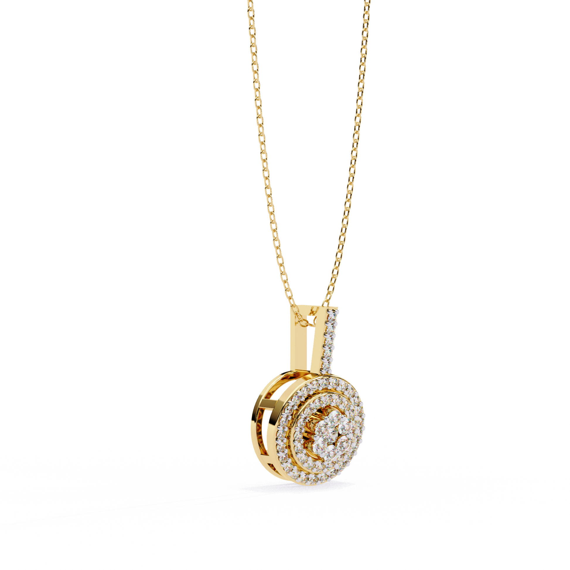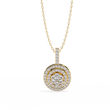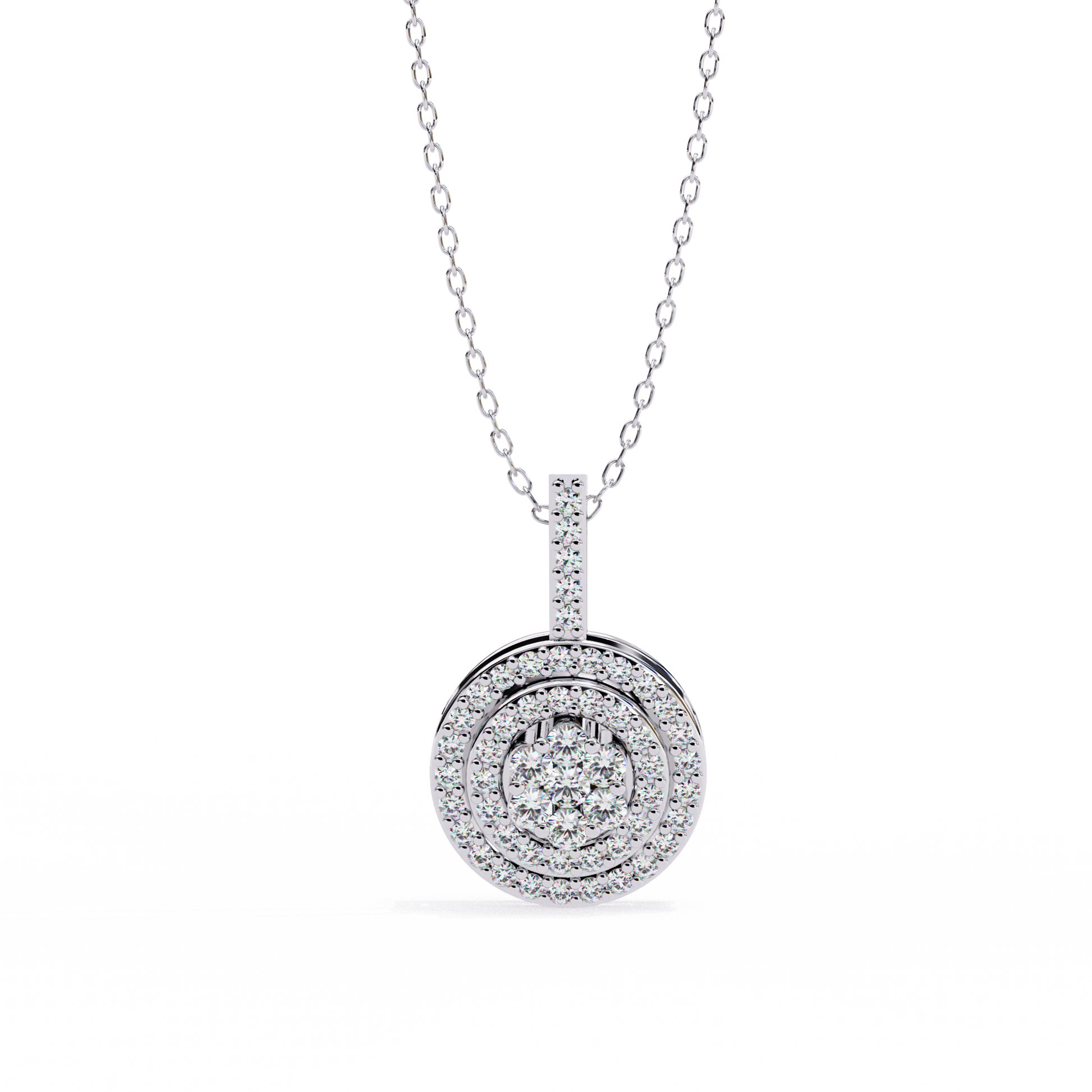 This stunning pendant showcases a dazzling circular design crafted in rich gold, featuring a captivating Cluster of Brilliant Round Diamonds at its center. Encircling the centerpiece are two concentric halos of smaller, meticulously set diamonds that amplify its sparkle and elegance. The diamond-encrusted bail adds a refined finishing touch, making this piece a perfect symbol of timeless luxury and radiant beauty, ideal for adding glamour to any special occasion or everyday look by Ivevar.