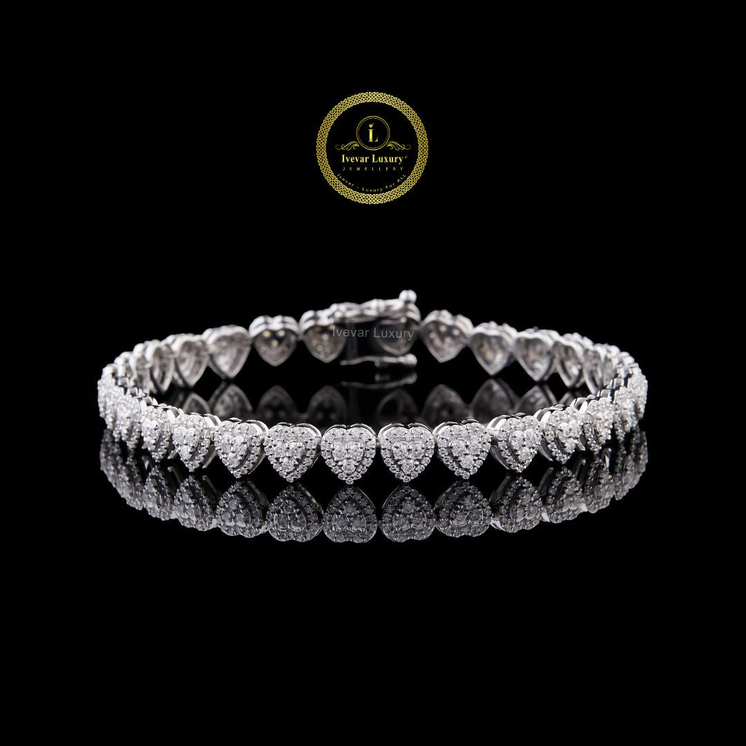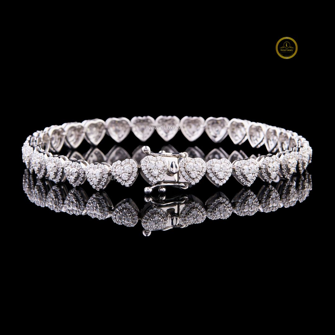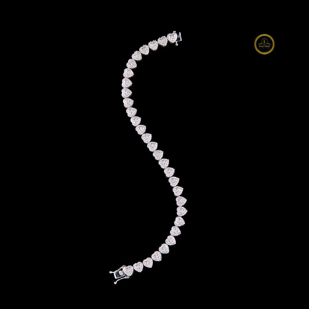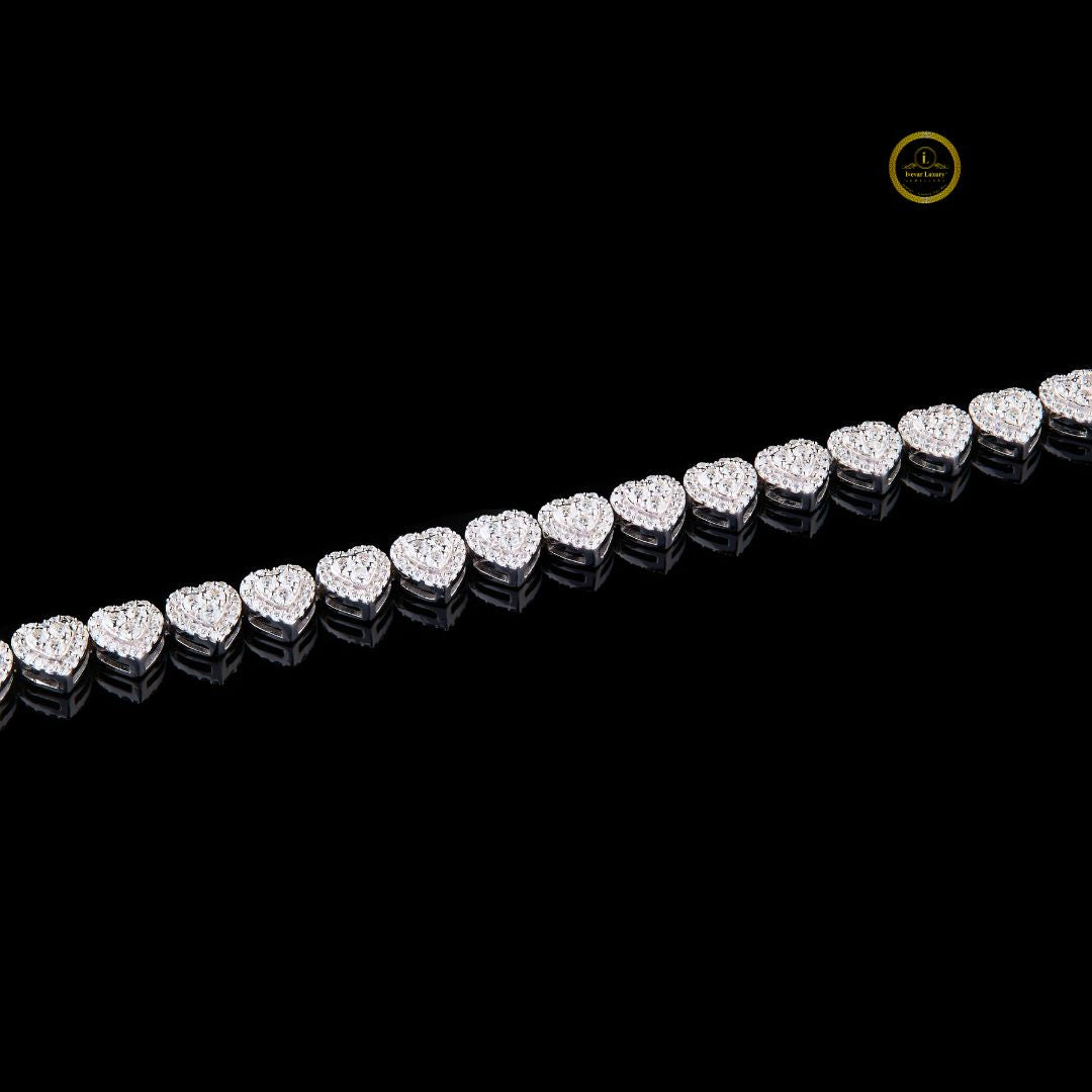 This is a beautiful and luxurious take on the classic tennis bracelet, featuring a continuous line of sparkling, close-set heart-shaped motifs. Each heart is fully encrusted with pavé-set lab-grown diamonds or high-quality cubic zirconia, creating a brilliant, high-shine ribbon effect.