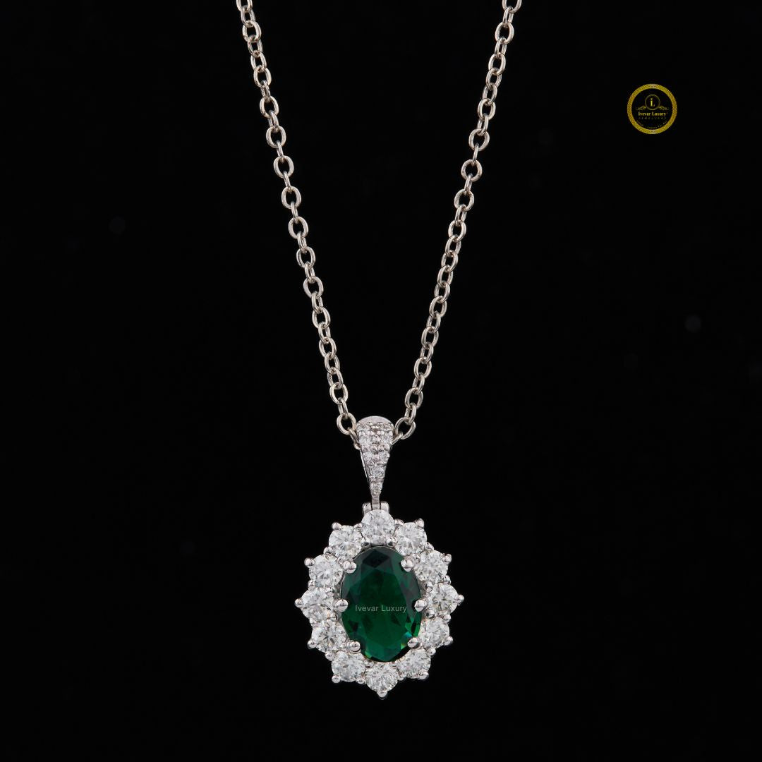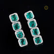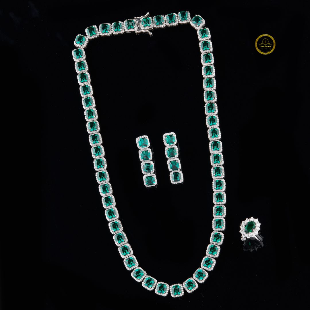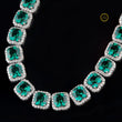 This luxurious piece features a line of individually set, square-cut Cushion-green stones—likely moissanite—each surrounded by a delicate halo of smaller, brilliant white stones. This popular design choice, known as a halo setting, maximizes sparkle and makes the main stones appear larger. The meticulous arrangement creates a continuous band of vibrant green color and intense fire, characteristic of high-quality moissanite. The chain's overall aesthetic is bold yet elegant, suggesting a premium, high-end piece suitable for making a distinct fashion statement. The dark, polished background highlights the jewelry's brilliance and craftsmanship.