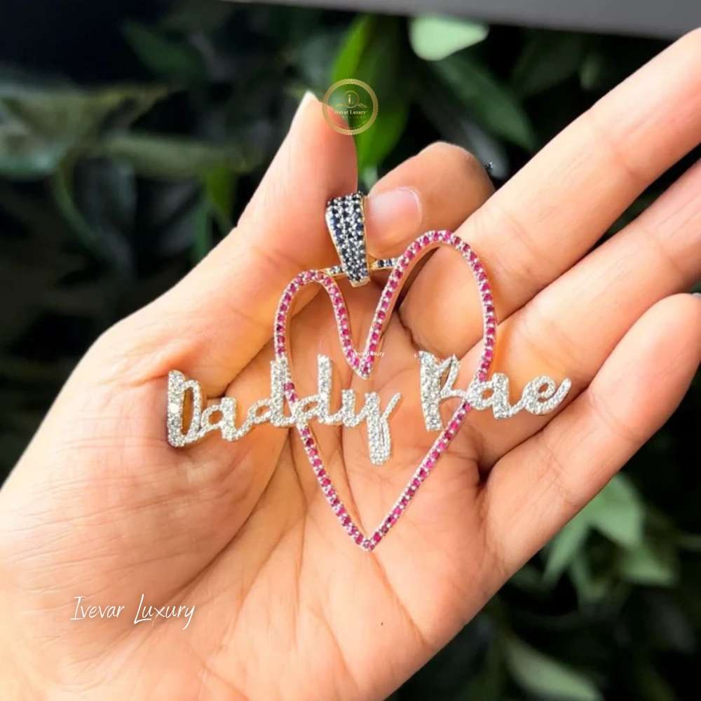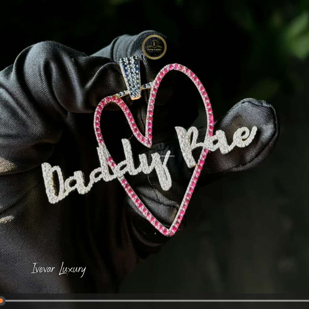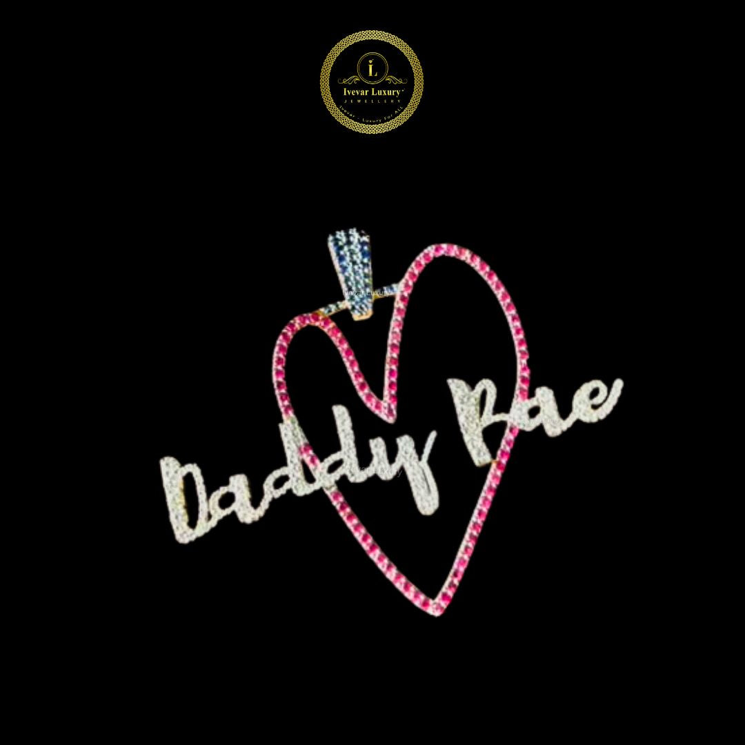 At the center, the words "Daddy Rae" are spelled out in a flowing script, completely set with white, brilliant-cut lab-grown diamonds. This combination of a playful, personalized message and colorful, high-end materials gives the piece a bold and custom luxury feel.