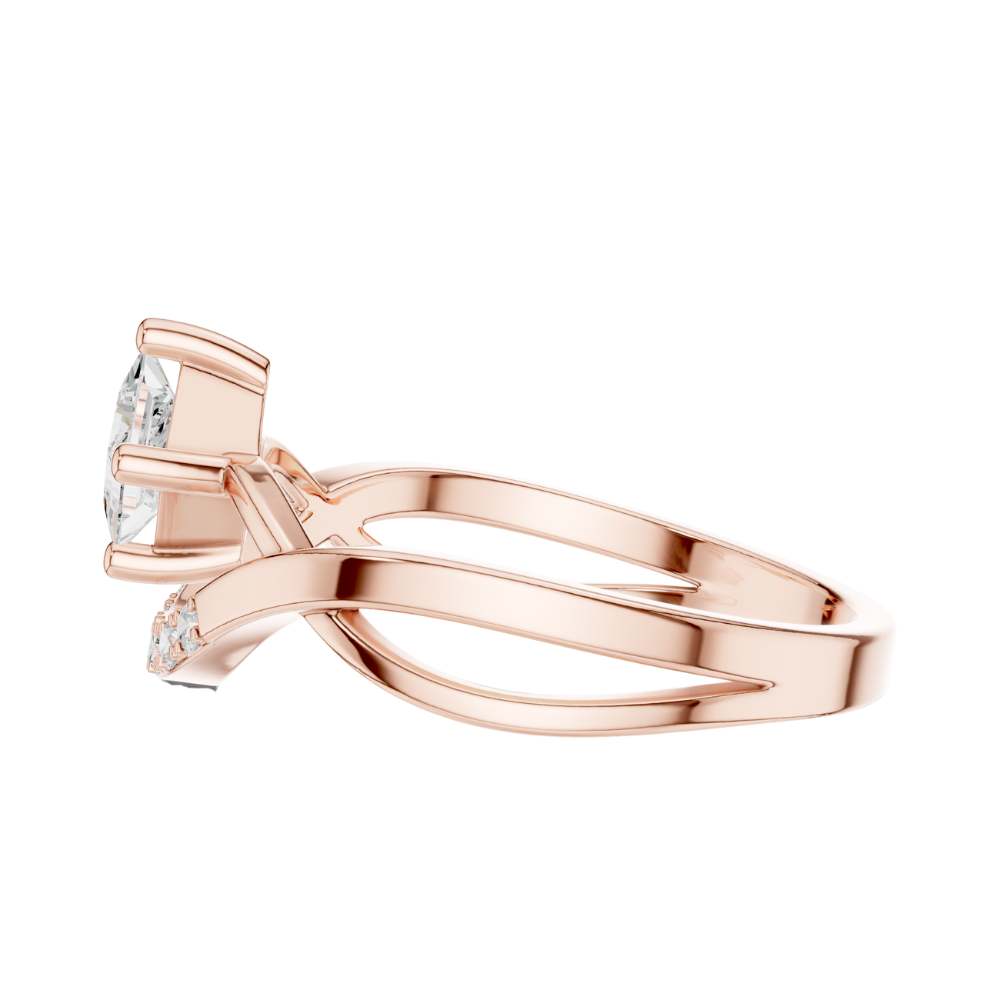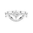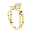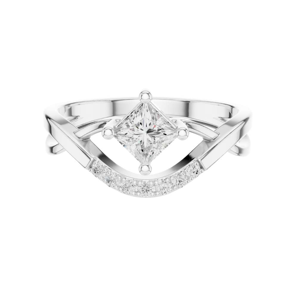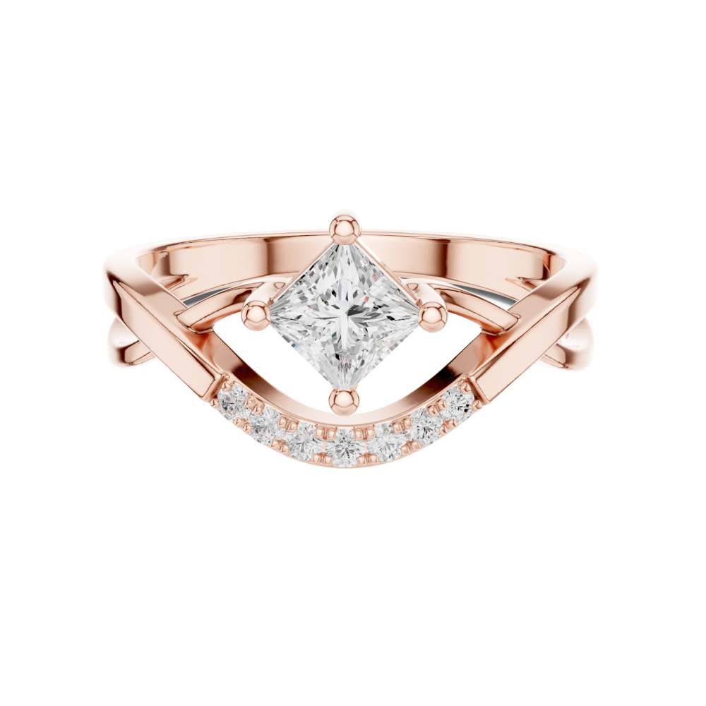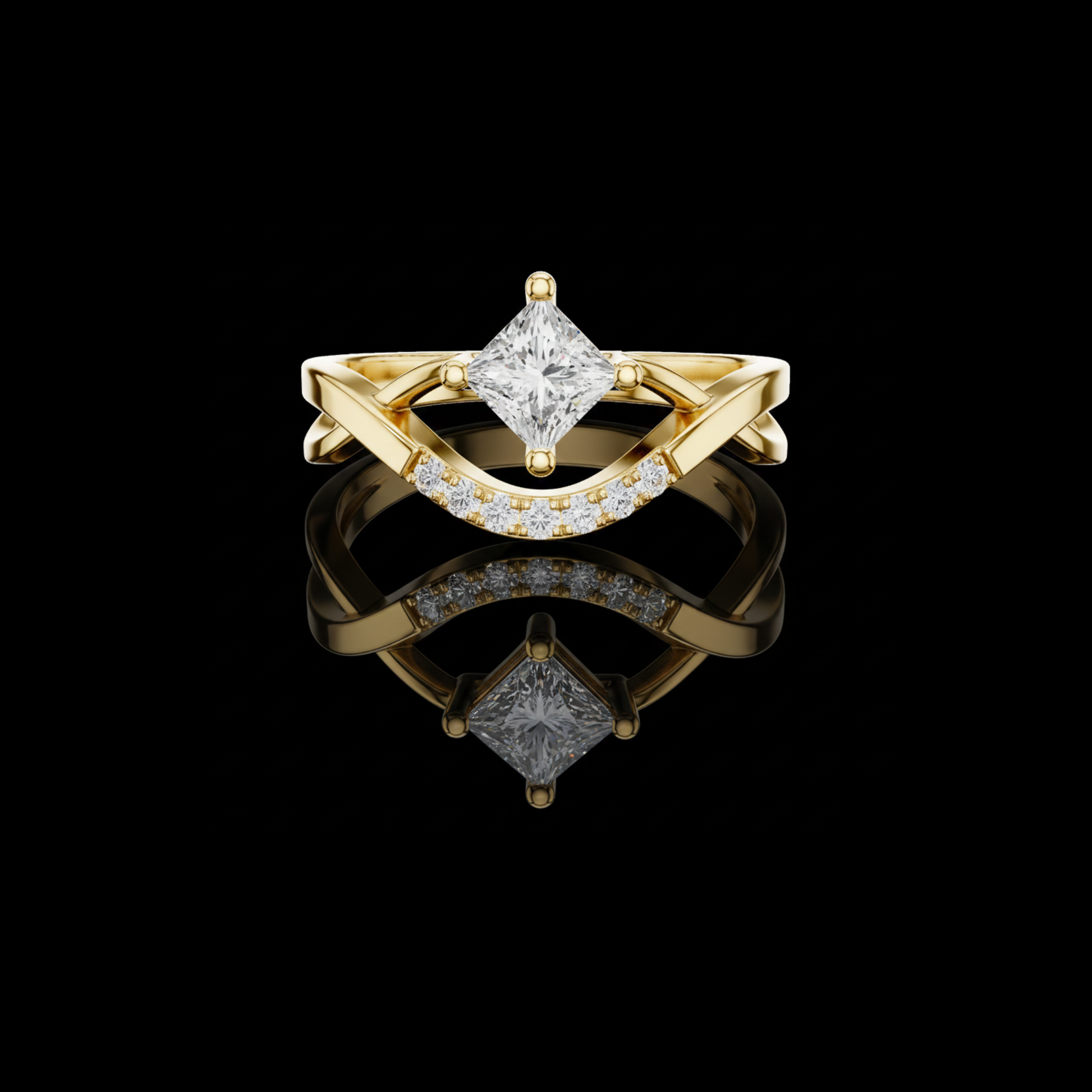 This elegant ring features a striking princess-cut diamond set in a unique floating-style frame, held securely by four rounded prongs that give the center stone a light, airy presence. Crafted from polished gold, the open, split-style band enhances the modern silhouette while a graceful curved row of pave-set diamonds adds brilliance and balance to the design. The combination of geometric precision and soft, sculpted lines creates a refined, contemporary piece perfect for anyone who loves distinctive yet timeless fine jewelry.