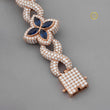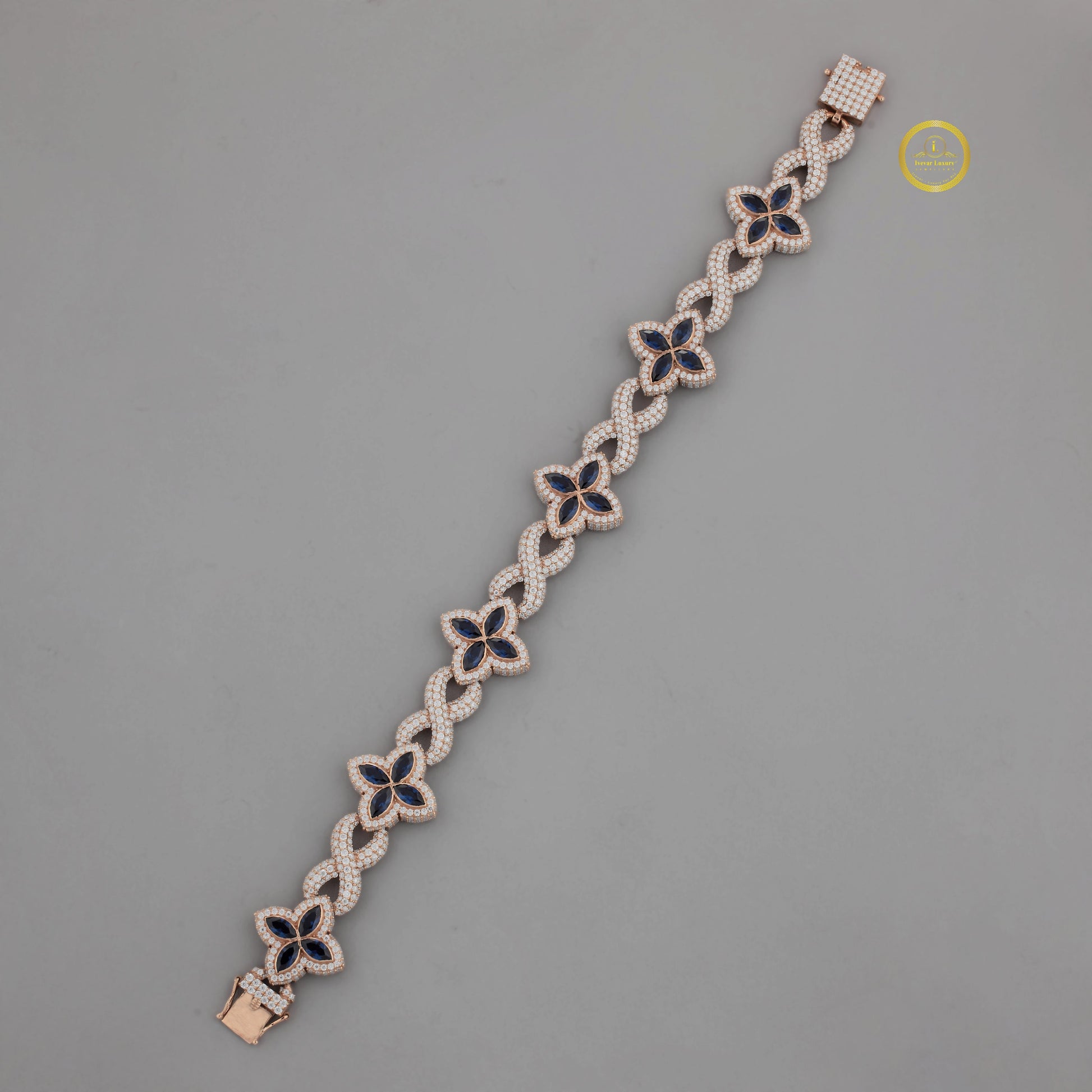 The design is characterized by repeating flower-shaped links, each centered with a contrasting, deep blue stone (likely a sapphire or similar gemstone) which is accented by sparkling lab-grown diamonds. The overall setting appears to be a warm rose gold color, which beautifully complements the dark blue and brilliant white stones. The bracelet is a sophisticated statement piece, suggesting luxury and intricate craftsmanship. As a lab-grown diamond piece, it offers excellent clarity and fire while presenting an ethical and high-quality alternative to traditional fine jewelry. It secures with a sleek clasp, making it suitable for special occasions.