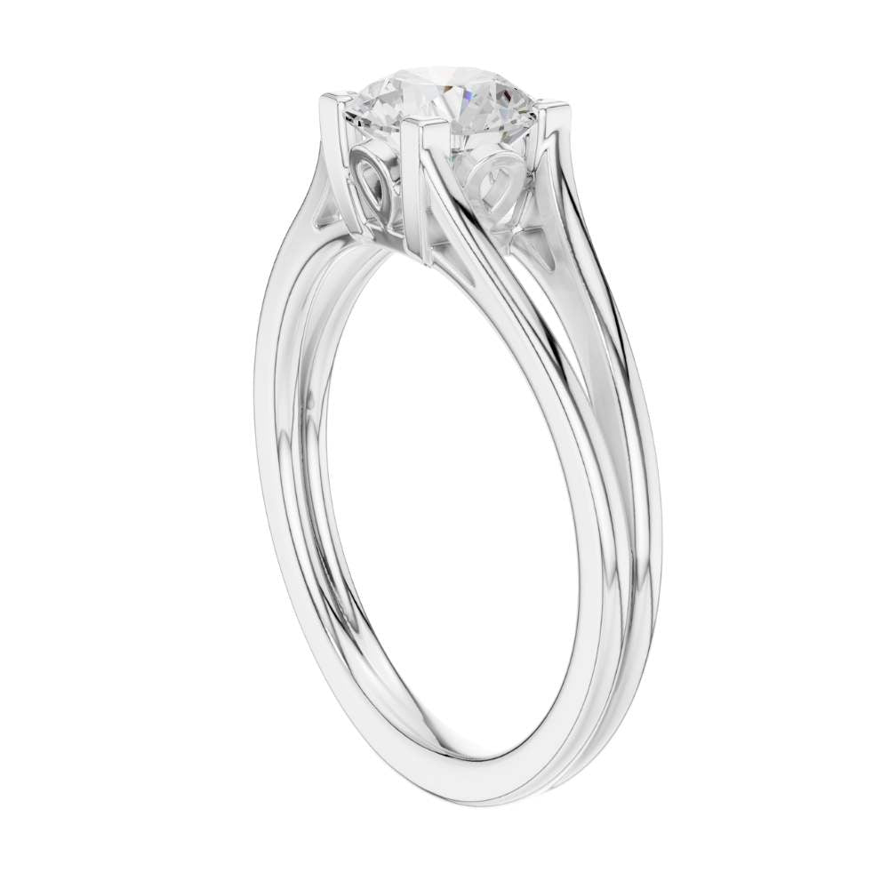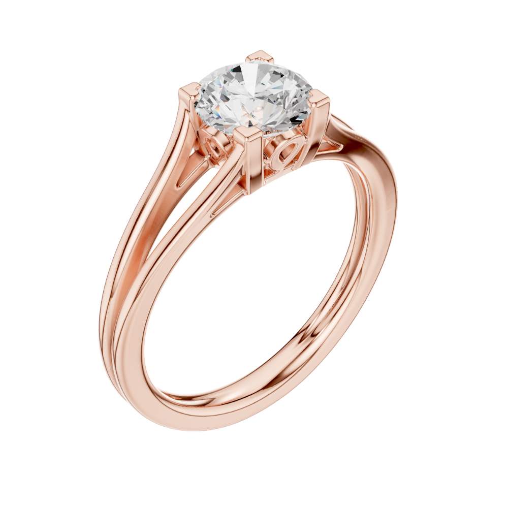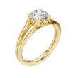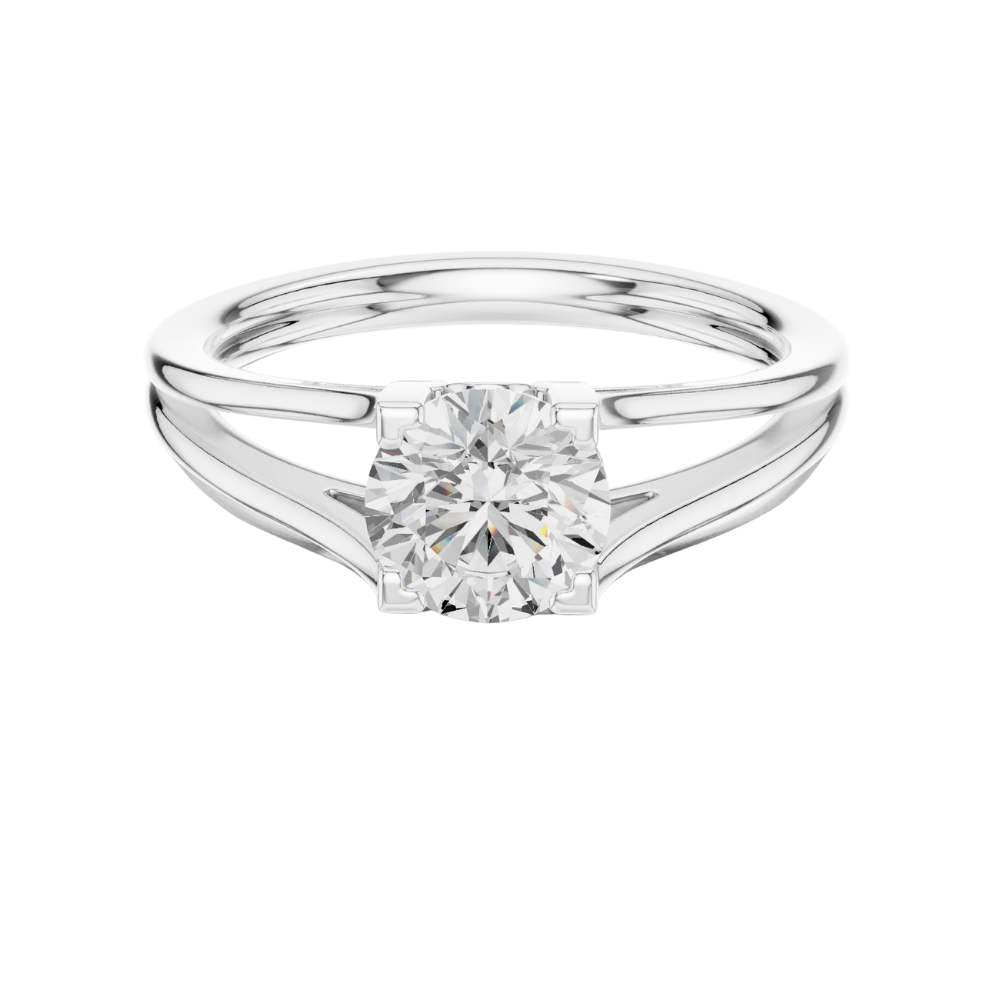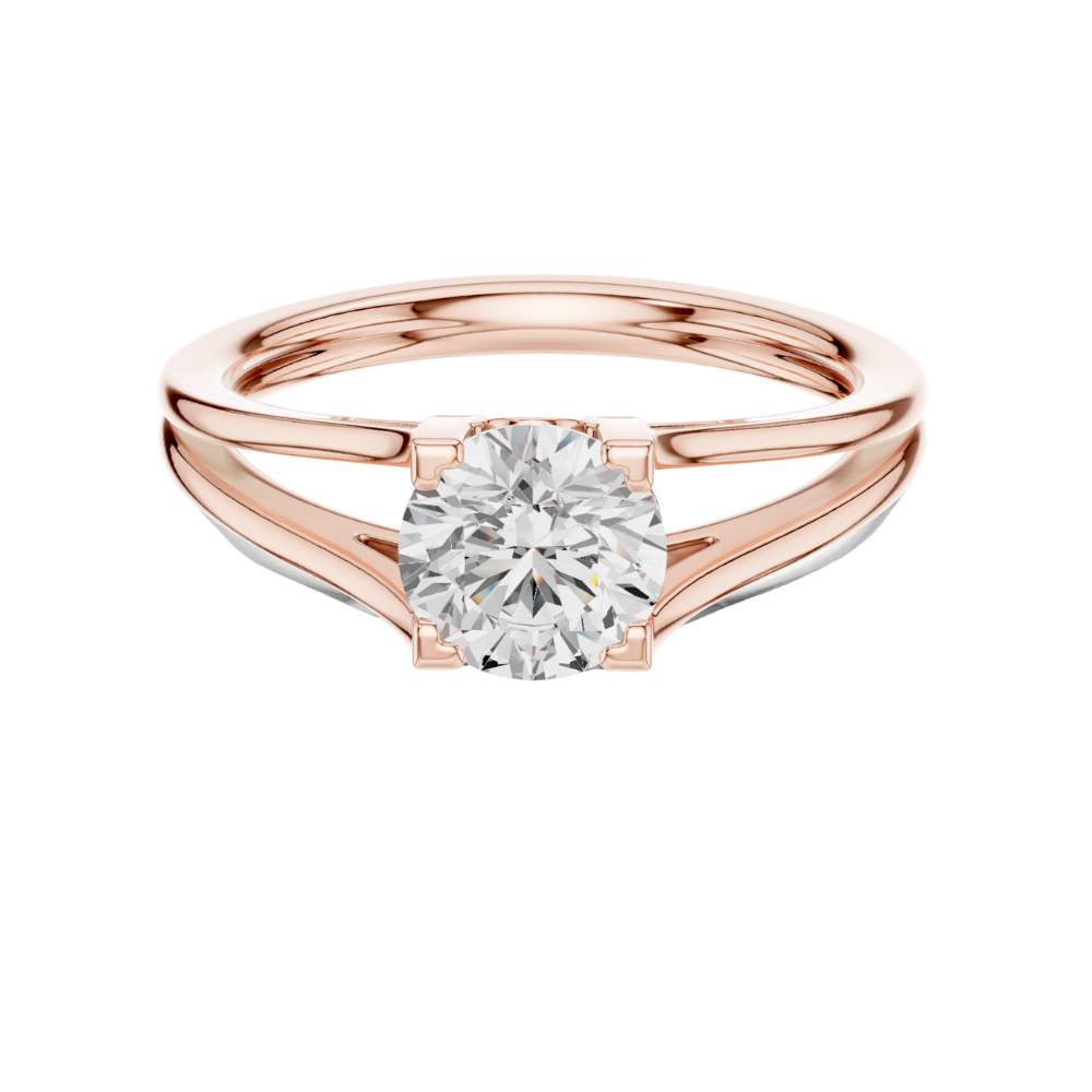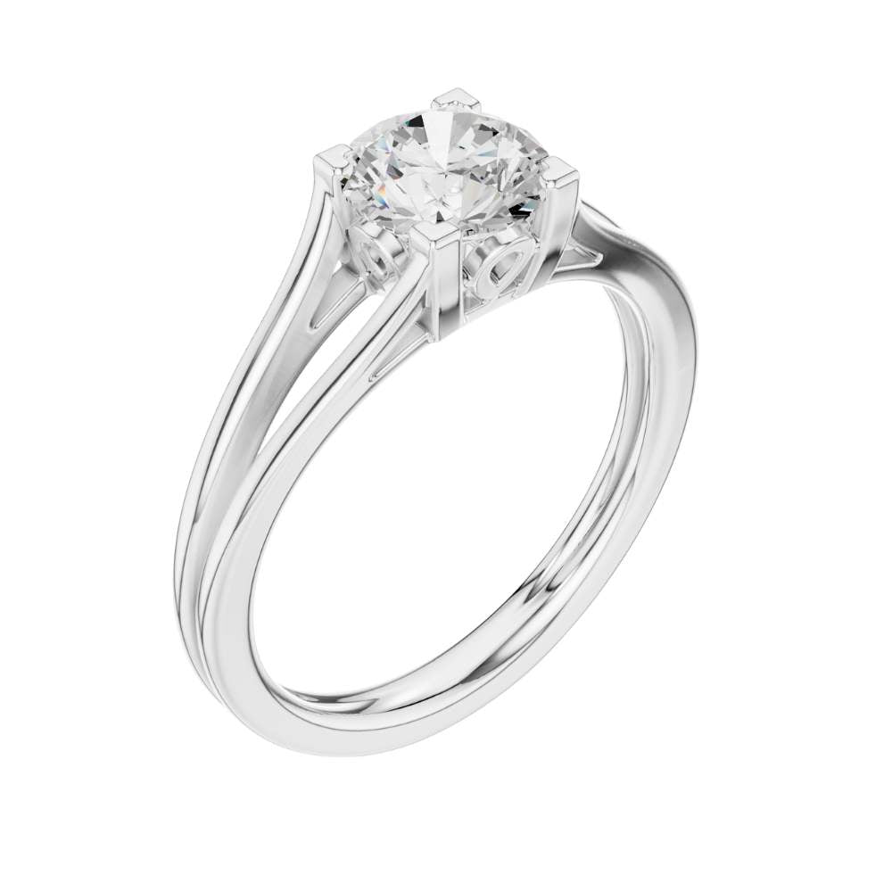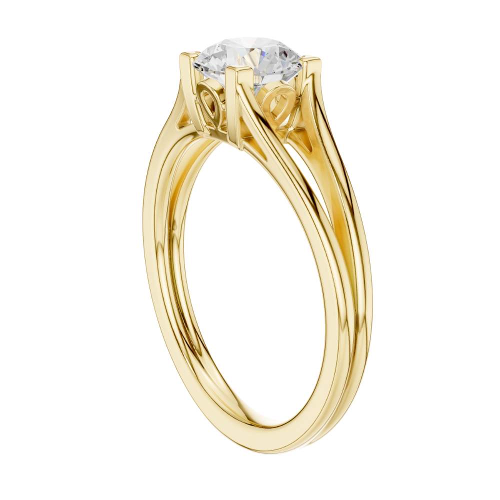 This captivating engagement ring features a radiant round brilliant diamond held securely in a refined four-prong setting, beautifully framed by an elegant split-shank band crafted in polished gold. The split design adds graceful dimension and visual interest, enhancing the center stone’s brilliance while maintaining a balanced, modern silhouette. Perfect for anyone seeking a blend of classic sparkle and contemporary style, this ring offers a sophisticated and timeless expression of love from Ivevar Luxury.