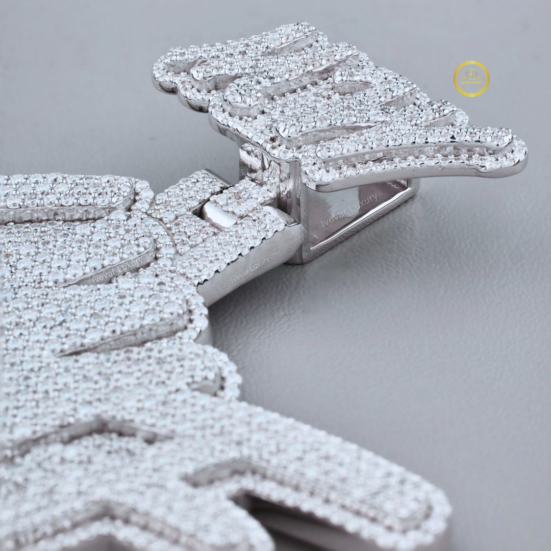 This striking piece is a custom lab-grown diamond pendant, characteristic of luxury hip-hop jewelry. The piece showcases meticulous pave setting, where numerous small, brilliant-cut lab diamonds cover the entire surface, maximizing sparkle and brilliance. The design is a bold, stylized script—appearing to be initials like "6MF" or a short word—giving it a high level of personalization. The use of lab-grown diamonds provides a sustainable and cost-effective alternative to natural diamonds, offering exceptional quality and fire. It is a substantial statement piece meant to be worn on a thick chain.