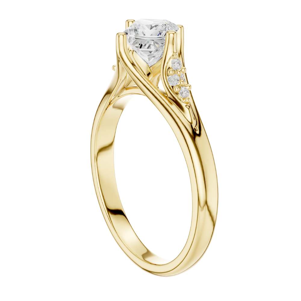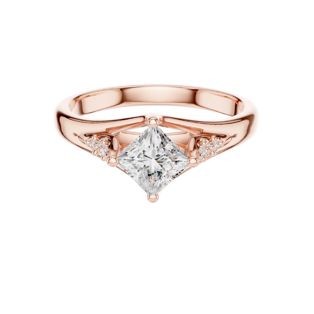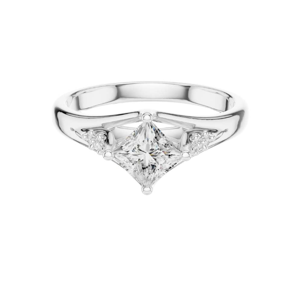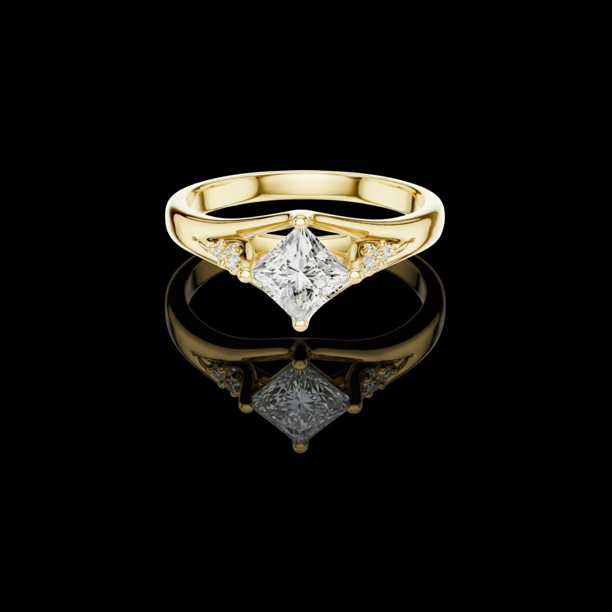 This exquisite ring features a striking princess-cut center diamond set in a polished gold band, creating a perfect blend of modern geometry and timeless warmth. The center stone is framed by delicate round diamond accents on each side, adding subtle brilliance and enhancing the ring’s refined elegance. With its clean lines, graceful setting, and radiant gold finish, this piece offers a sophisticated and romantic aesthetic ideal for engagements, anniversaries, or meaningful gifts by Ivevar Luxury.