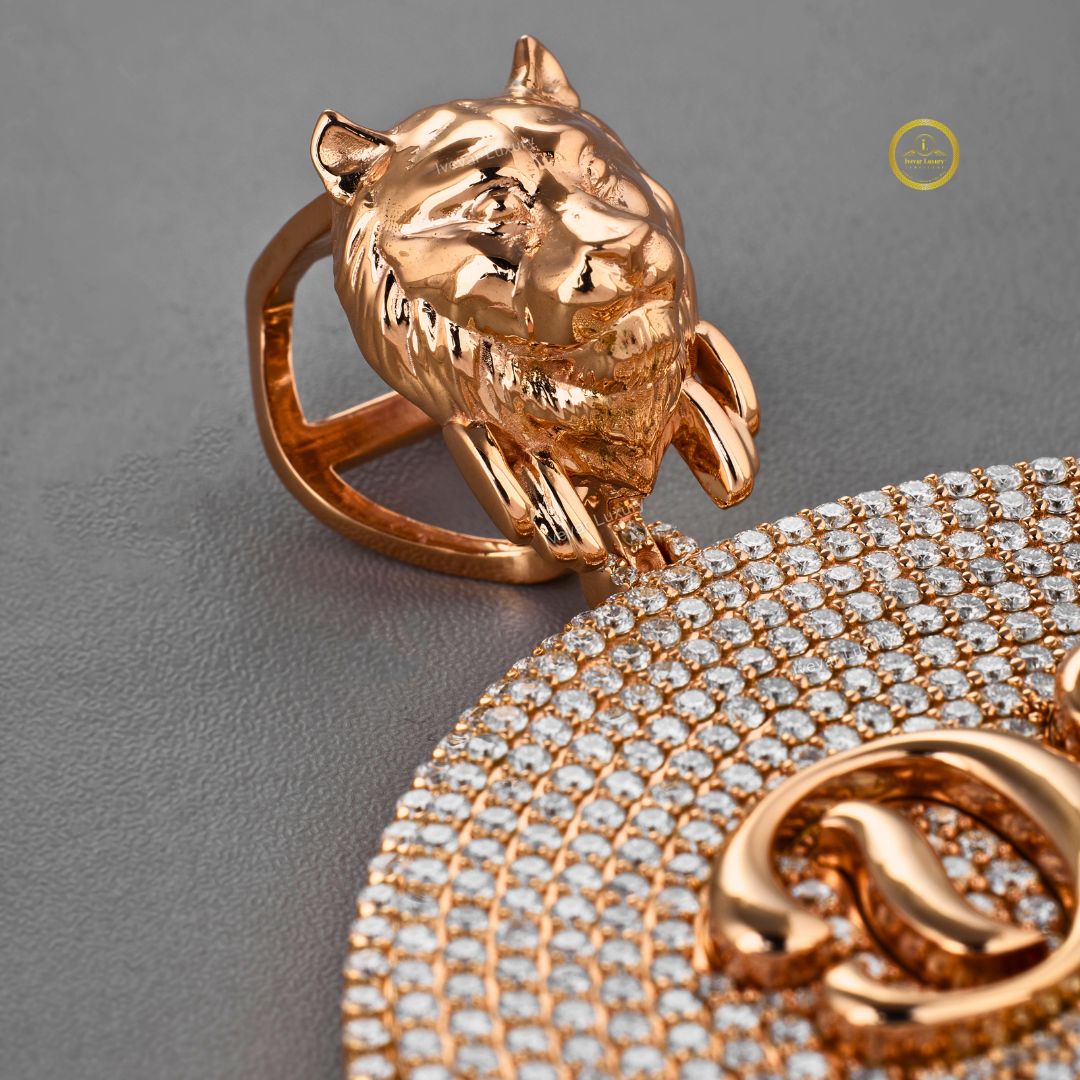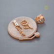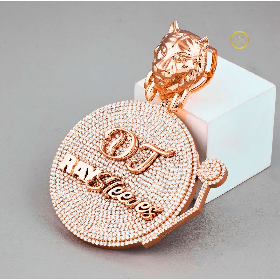 The surface is customized with the text "DJ" and "RAY Sleeves" in contrasting smooth and raised rose gold lettering. The bail for the chain is a sculpted lion's head—fully detailed and crafted in rose gold—adding an element of strength and luxury. This unique piece perfectly blends a dedication to music and deejaying with high-end, personalized hip-hop jewelry style.
