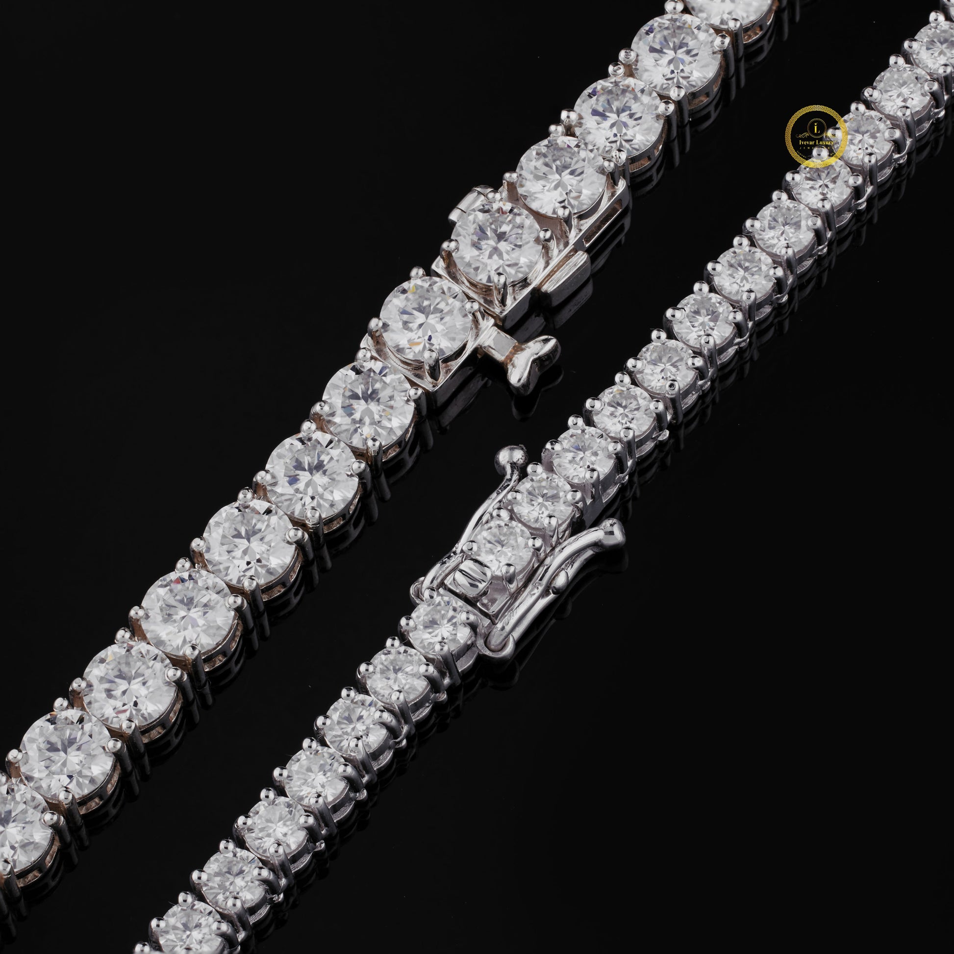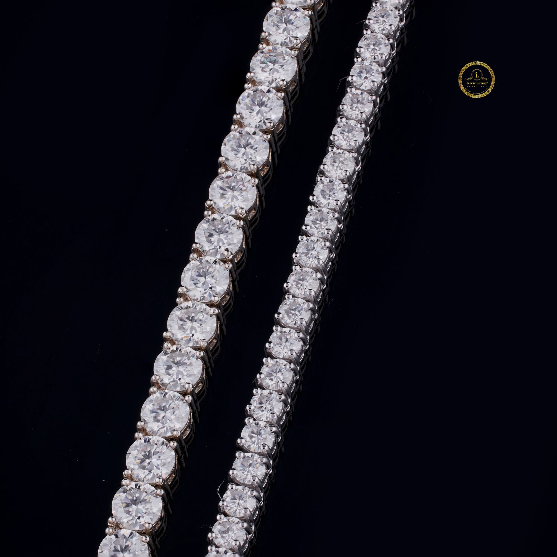 This image displays a magnificent double-layered tennis chain adorned with brilliant moissanite stones, an excellent and durable alternative to natural diamonds. The design features a classic, flexible line of individually set, round-cut stones.