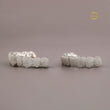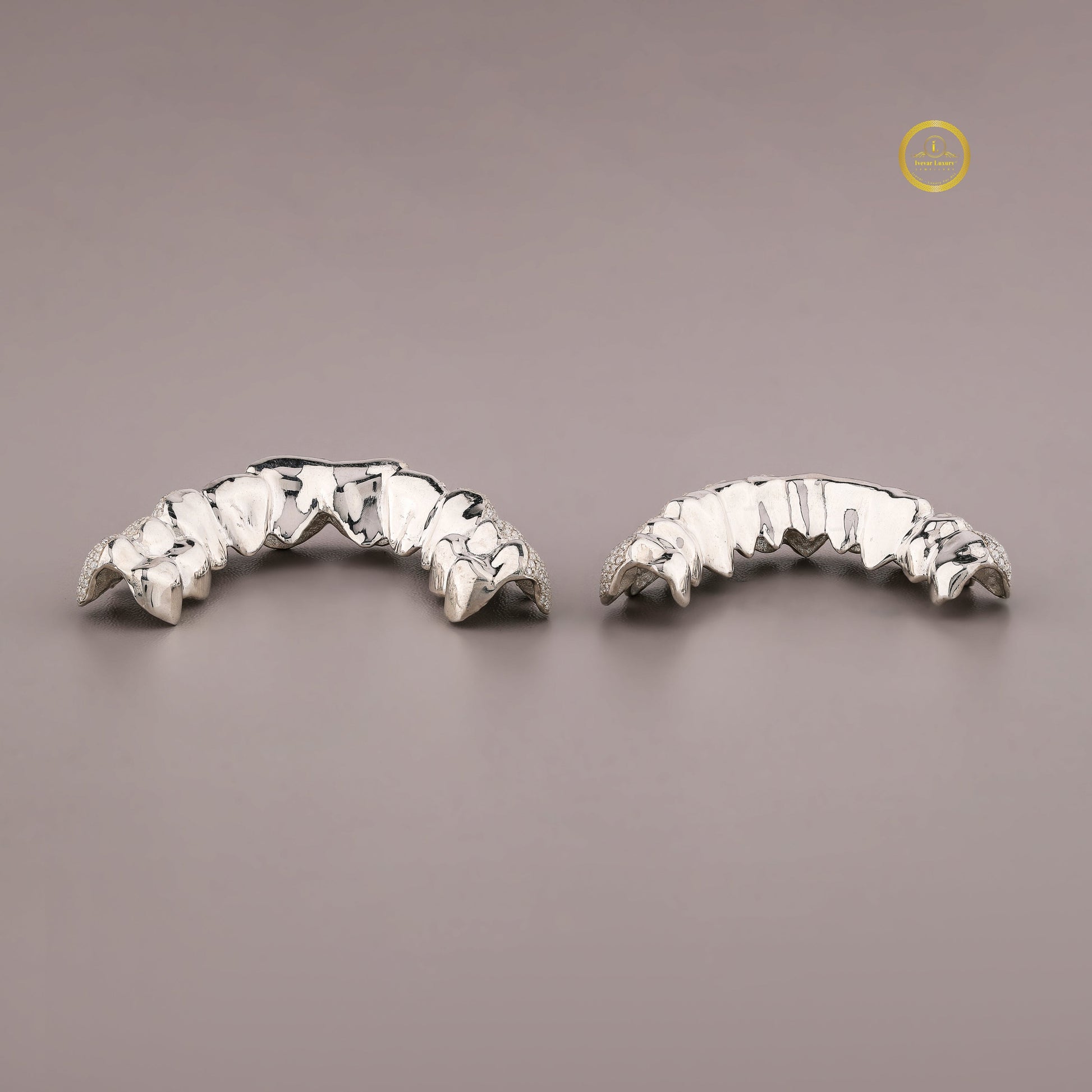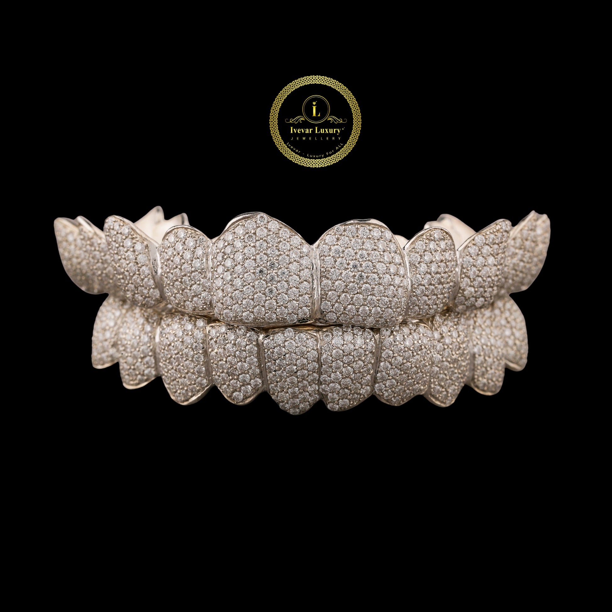This impressive set of custom grillz is a luxurious display, covering both the upper and lower teeth in a "full set" style. The design utilizes a technique known as pave setting, where numerous small Moissanite stones are set closely together. Moissanite is valued for its superior brilliance and fire compared to natural diamonds, offering a stunning, reflective, "iced out" look.