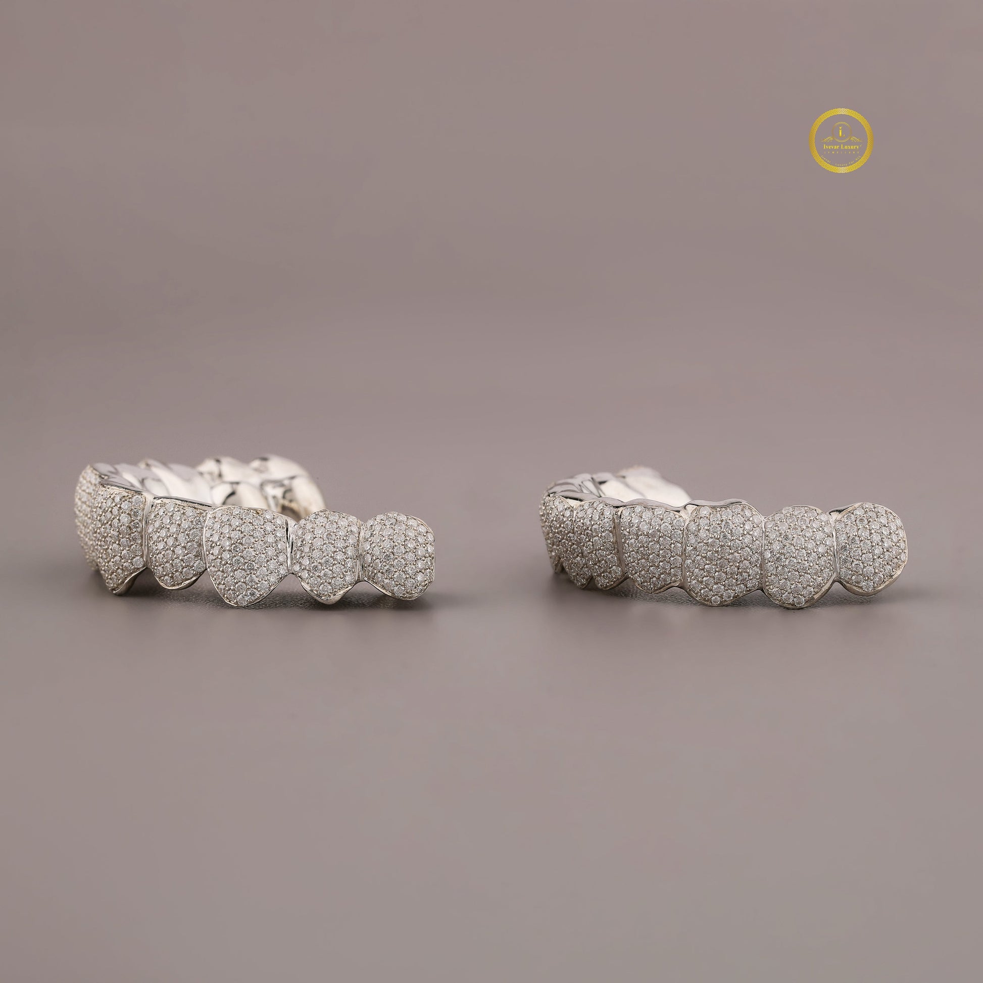 The effect is one of solid diamond coverage, maximizing the sparkle and visual impact across the entire smile. As custom grillz, they are tailored to the wearer's dental molds for a secure and comfortable fit. The metal appears to be white gold or sterling silver, complementing the colorless brilliance of the Moissanite stones, making this a bold and extravagant statement of high-end hip-hop jewelry.